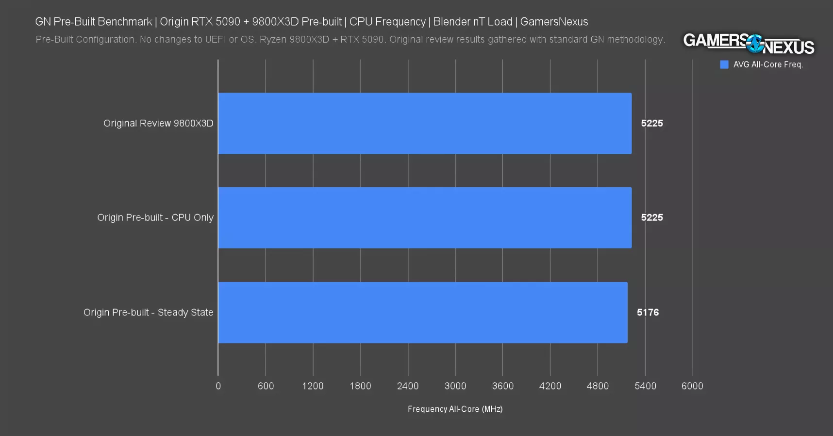 For CPU frequency, fortunately for Origin, it didn’t randomly throttle it by 1GHz this time. The 9800X3D managed to stay at 5225MHz during the CPU-only load portion of torture test – the same frequency that we recorded in our original review for the CPU so that’ good. At steady state with the GPU dumping over 500W of heat into the case, the average core frequency dropped by 50MHz. If Origin made better use of its dozen or so fans, it should hold onto more of that frequency.