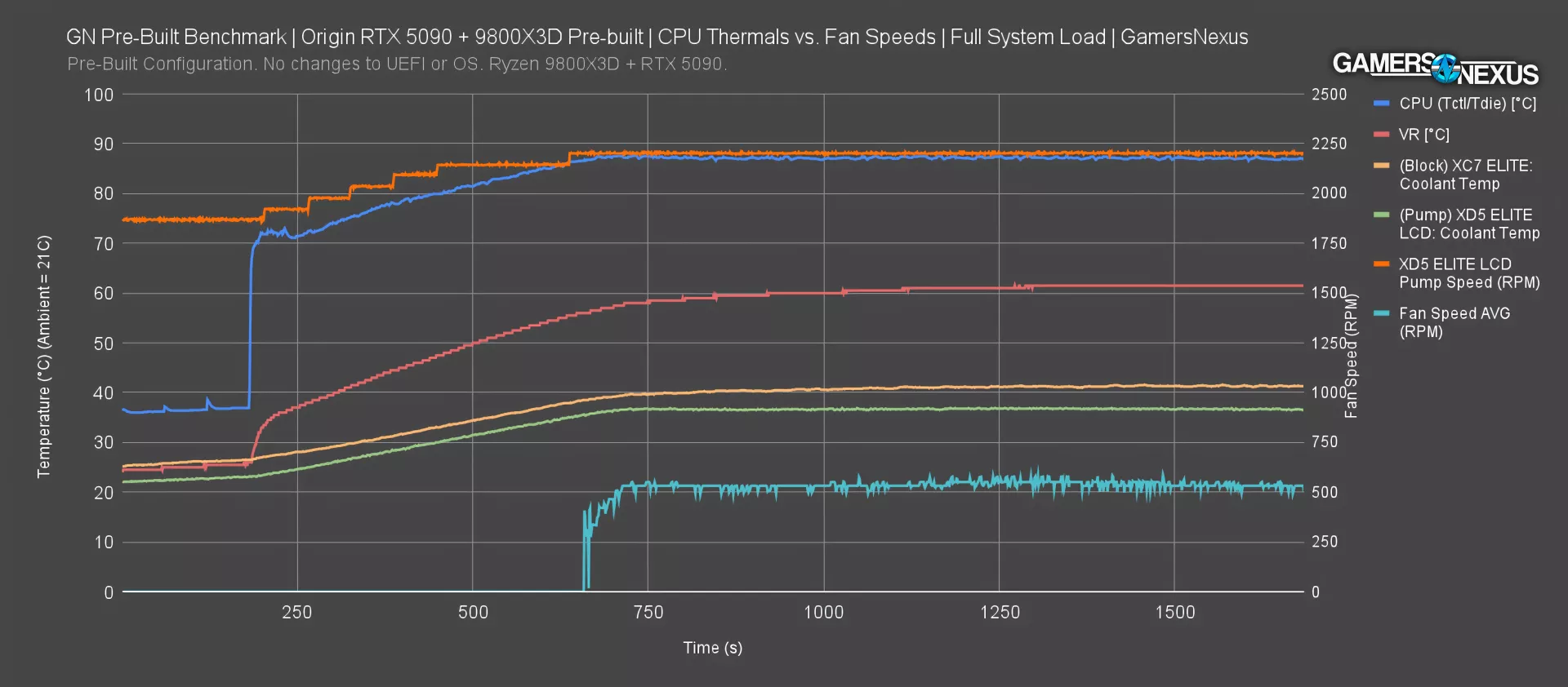 Finally, adding pump and fan speeds gives us the big reveal for why the curves look like this. The pump stair steps up in speed while the temperatures rise, but the fans don’t even turn on for over 8 minutes into the load’s runtime. Once they’re actually running, they average out to just 530RPM, which is so slow that they might as well be off.