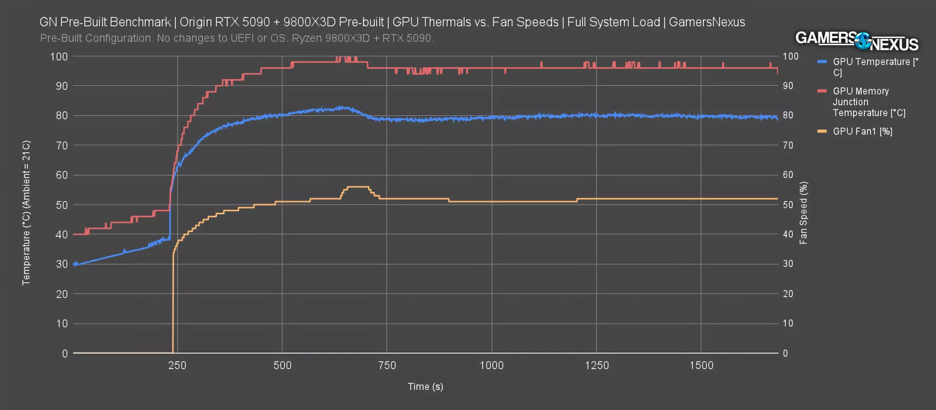 The 5090’s VRAM already runs hot on an open bench – 89 to 90 degrees Celsius – and that gets pushed up to peak at 100C in the Origin pre-built. This is unacceptable. Adding the GPU fan speed to the chart shows us how the Founders Edition cooler attempts to compensate by temporarily boosting fan speed to 56% during this time, which also means that Origin isn’t even benefiting as much from the noise levels as it should from the slower fans. Balancing them better would benefit noise more.