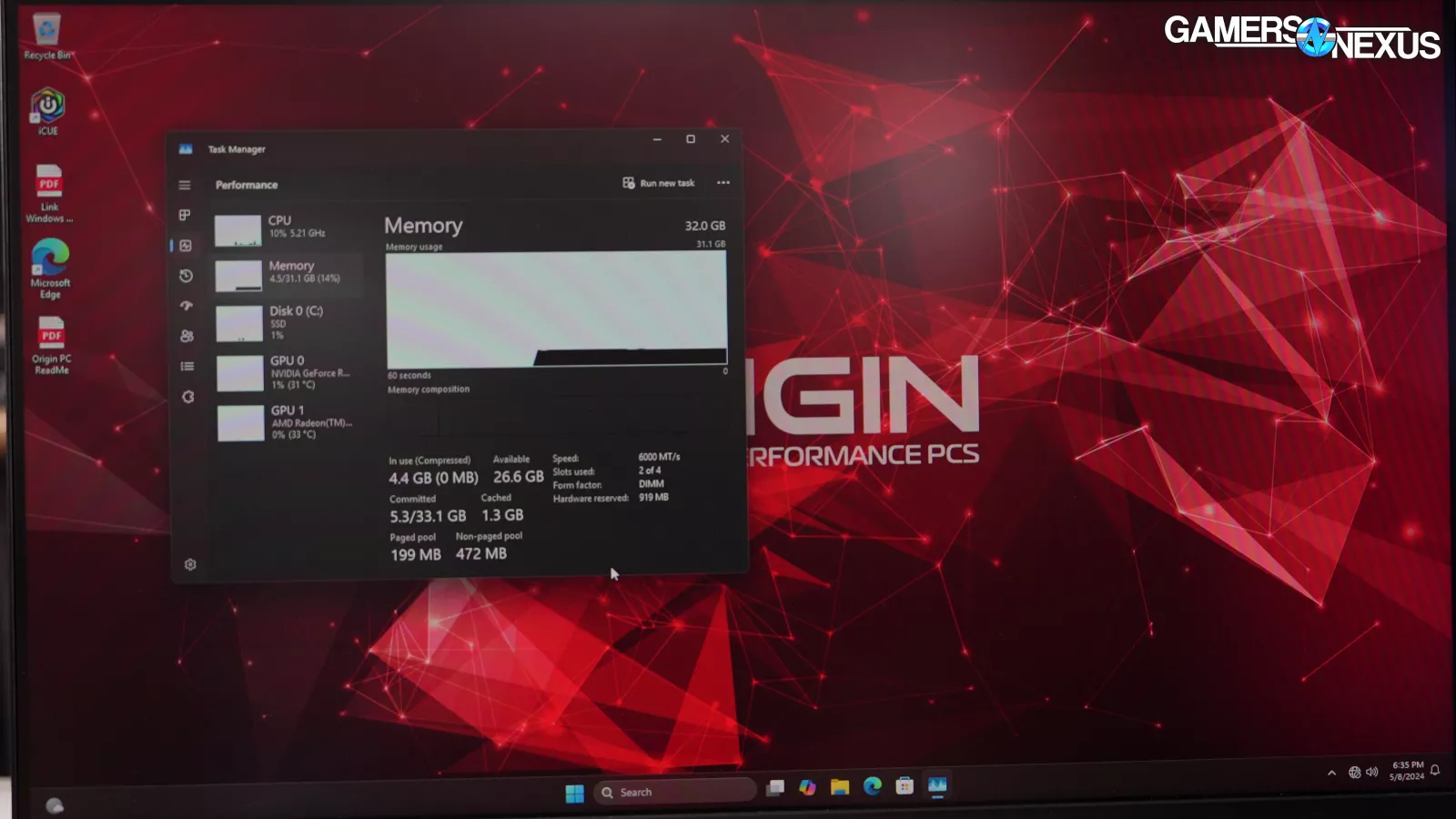 Look at the 16GB DDR 6000 RAM modules, they are in the correct slots and Origin outfitted them with Corsair 36-44-44-96 sticks, which are not the greatest timings.