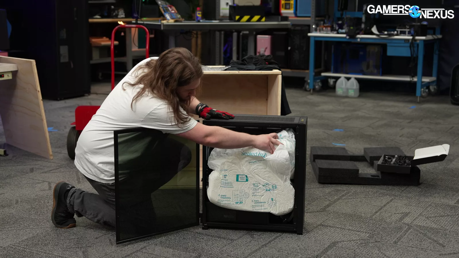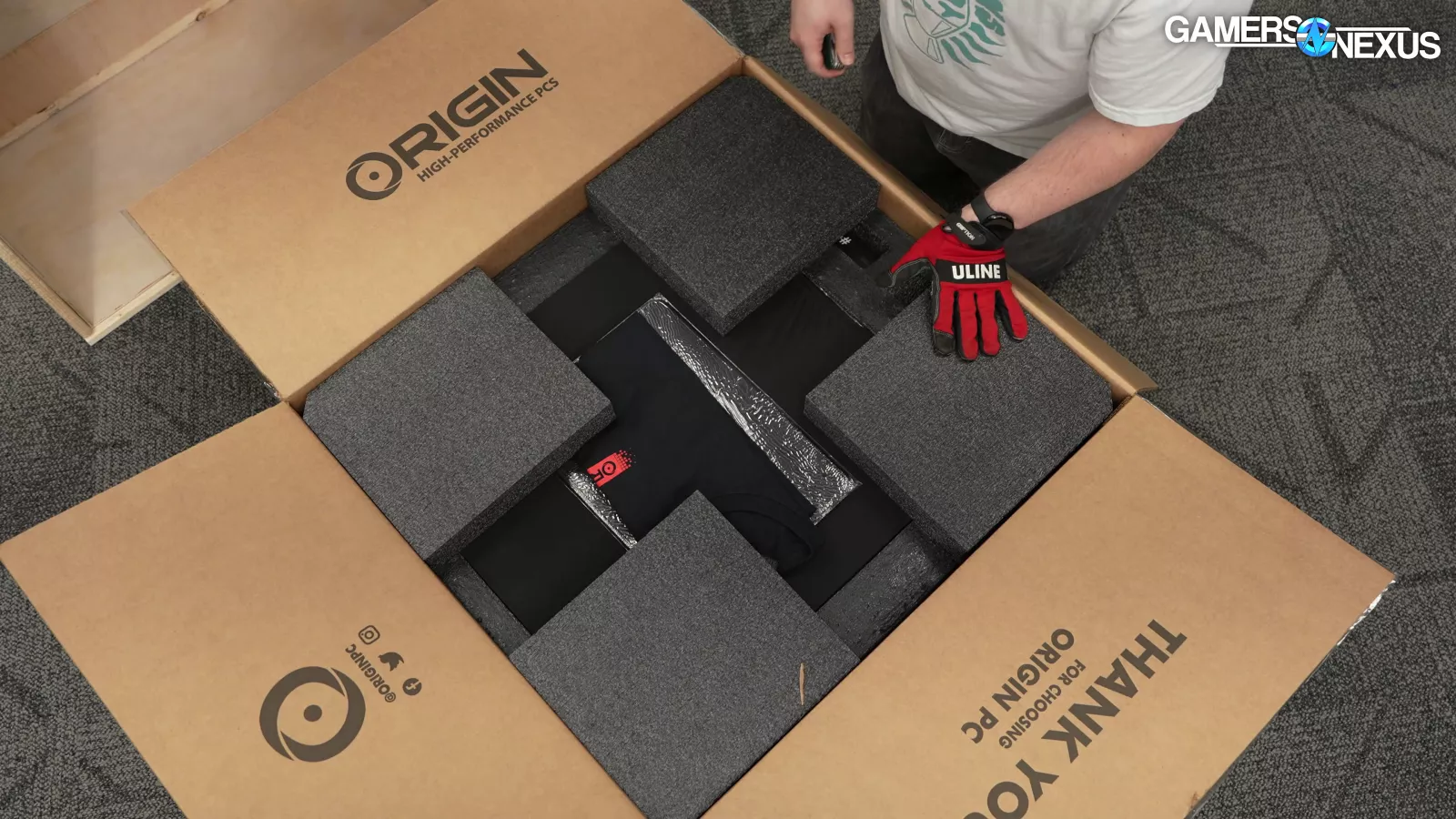 Origin uses foam, a fabric cover, a cardboard box within a crate, and the crate for the PC. The case had two packs of expanding foam inside it, allowing the GPU to arrive undamaged and installed. The sticker on the side panel also had clear instructions. These are good things.