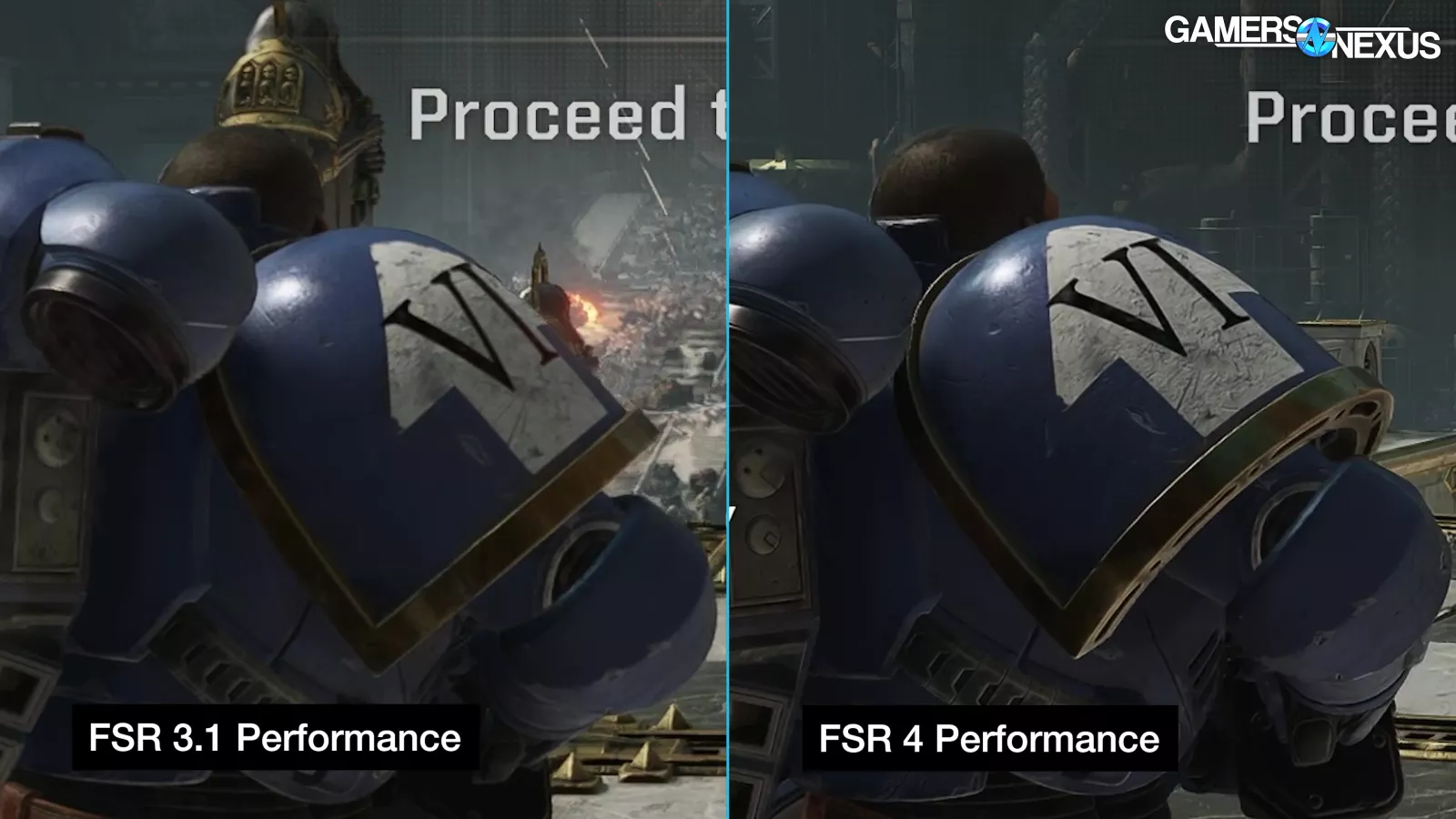 We’ll start the comparisons with a scene in the Armory, or “Armouring Hall” in native Grimdark. Even before walking forward, the difference between FSR 3.1 and FSR 4 is stark. Static elements like the floor of the walkway that shift and shimmer heavily with FSR 3.1 are now stably locked-in. On top of that, the entire image is much clearer and more detailed.