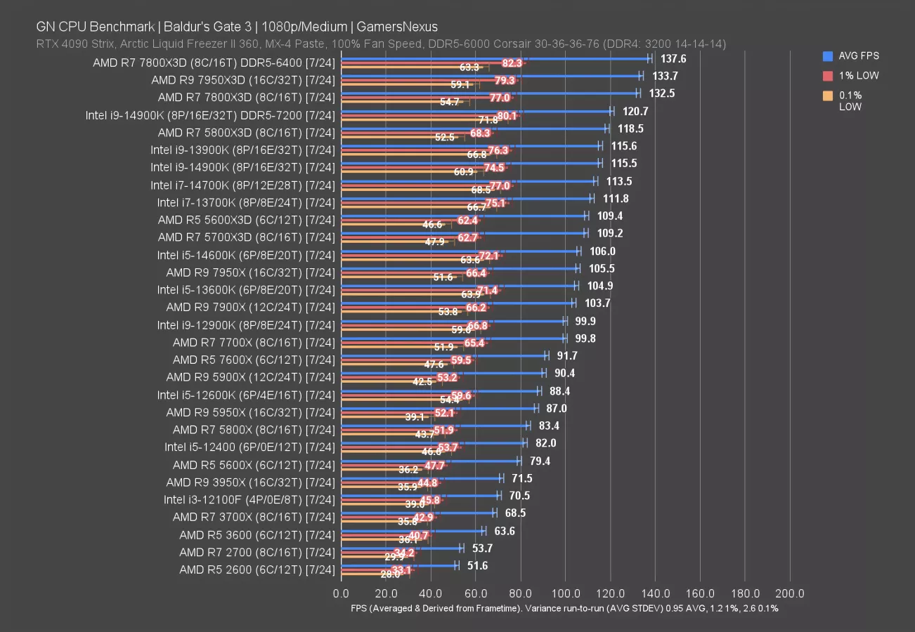 Baldur’s Gate 3 launched to critical acclaim in 2023. At 1080p/Medium, scaling is fairly clean all the way up the stack. Memory posts an uplift in this game, with the DDR5-6400 7800X3D result climbing 3.8% from the standard test and the 14900K climbing 5% with DDR5-7200.