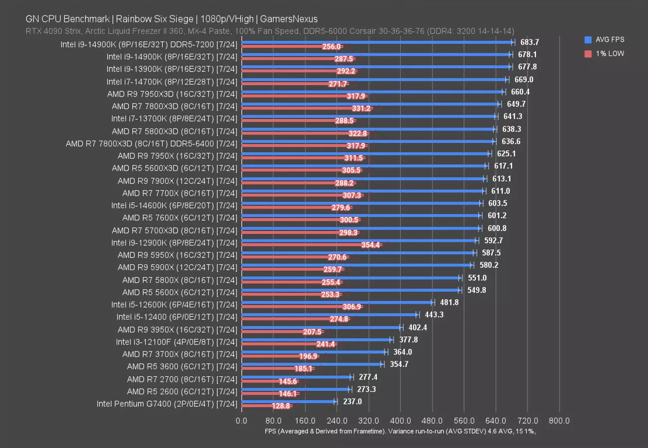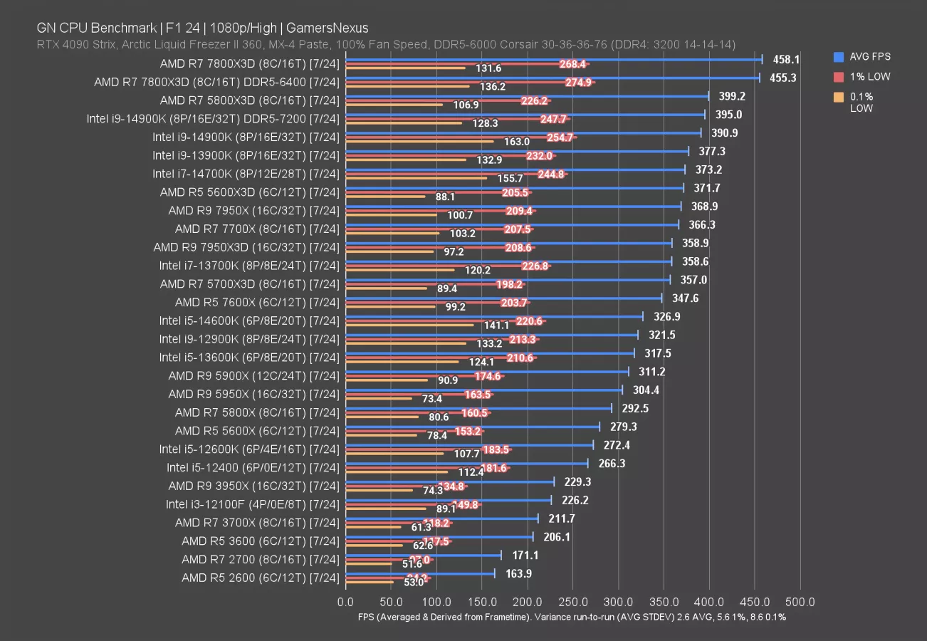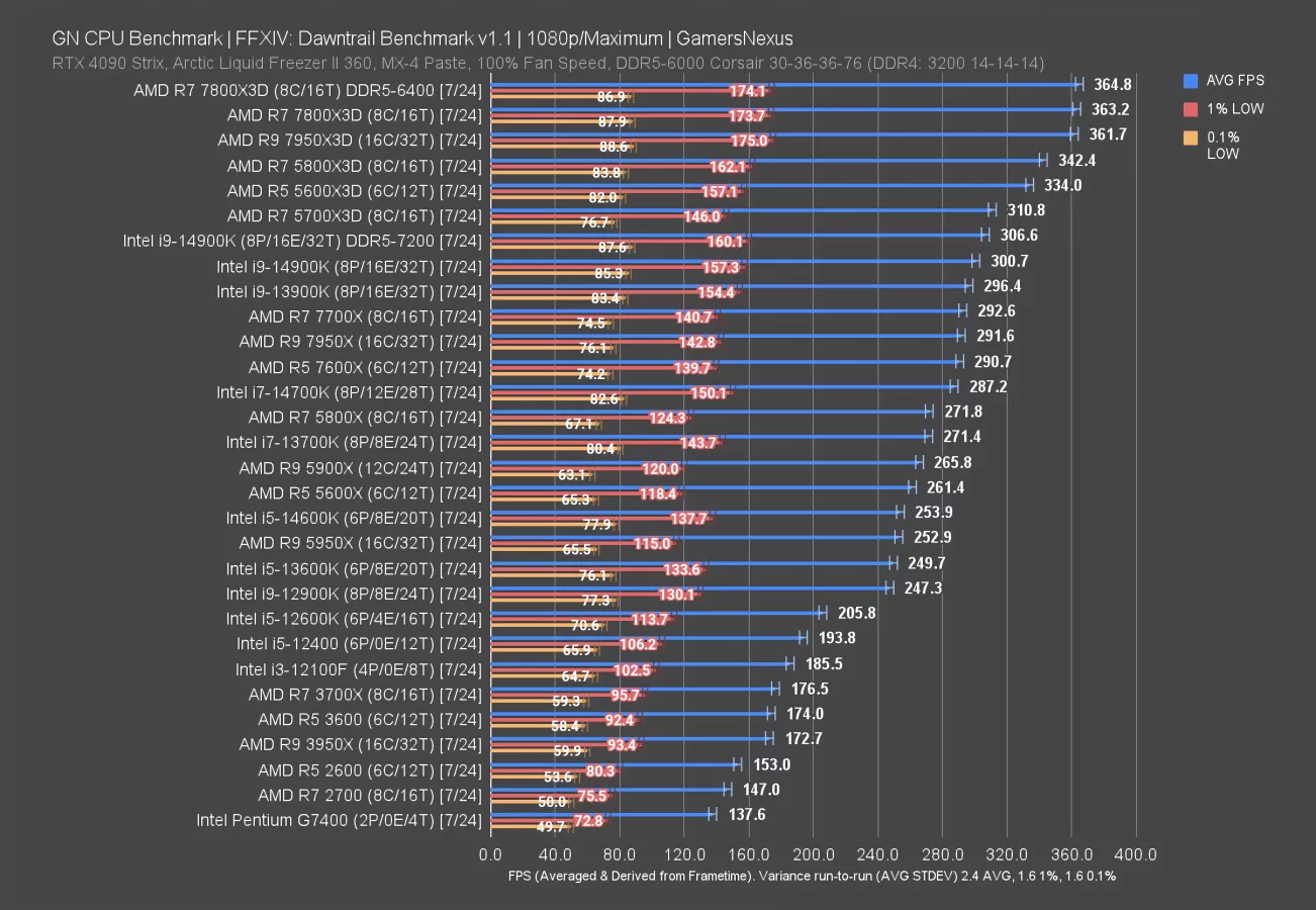 Intel’s 14900K (read our review) is the closest Intel competition, but underperforms against the 5800X3D. Notably, Intel’s 0.1% lows are generally advantaged over AMD’s in this specific game; however, variance is also high for lows in this title.