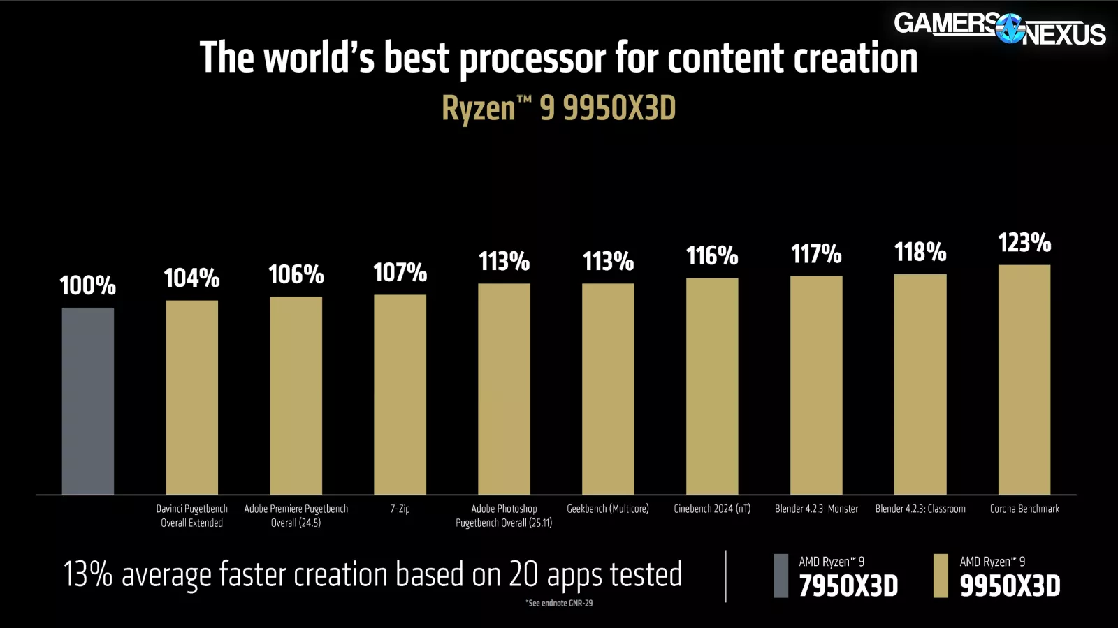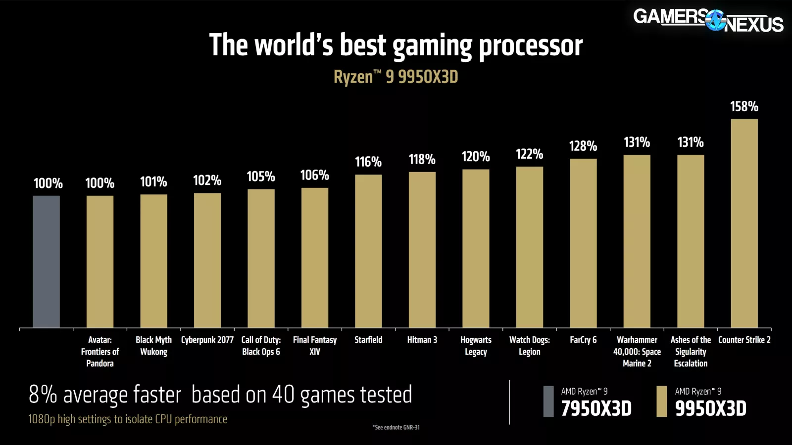 AMD says this is “the world’s best gaming processor,” though note that they are comparing it to the 7950X3D (watch our review). The 9950X3D is shown as being on average 8% better across 40 games that AMD tested, with a range of no change to a 58% uplift over baseline compared to the 7950X3D.