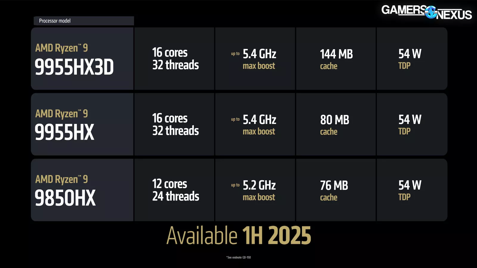 The 9955HX3D is a 16C/32T part that boosts up to 5.4GHz. It has 144 MB of cache and a TDP of 54W. The 9955HX is the same, but with less cache. The 9850HX is a 12C/24T part with lower boost, no X3D cache by mercy of its easier name, and the same TDP.
