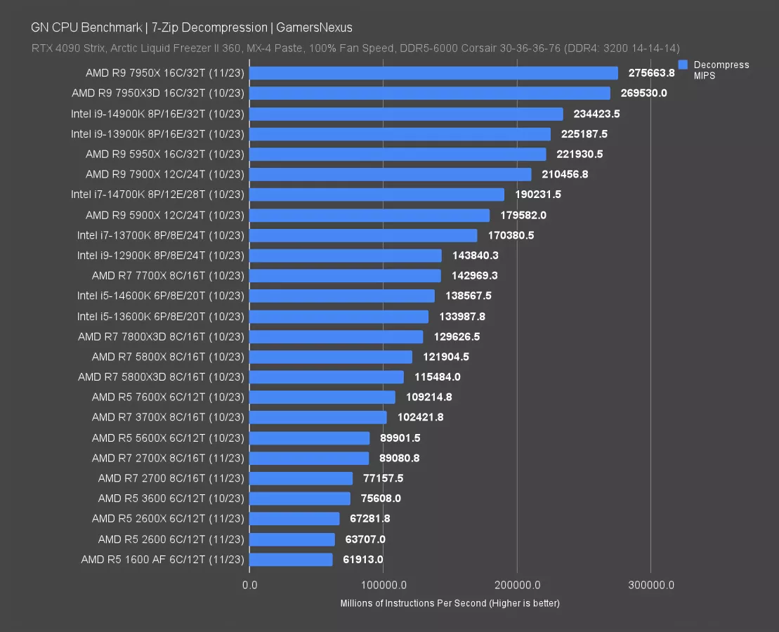 In this one, the 2600, the X, and the 1600 AF are all adjacent at the bottom of the updated chart. The 5600X would offer a meaningful uplift in file compression performance, with large gains coming from the 13600K or, if you can spend more, the 5950X. Newer CPUs like the 7900X or 7950X begin offering crazy performance improvements, but these would really only be worth paying for if you regularly run compression processes.