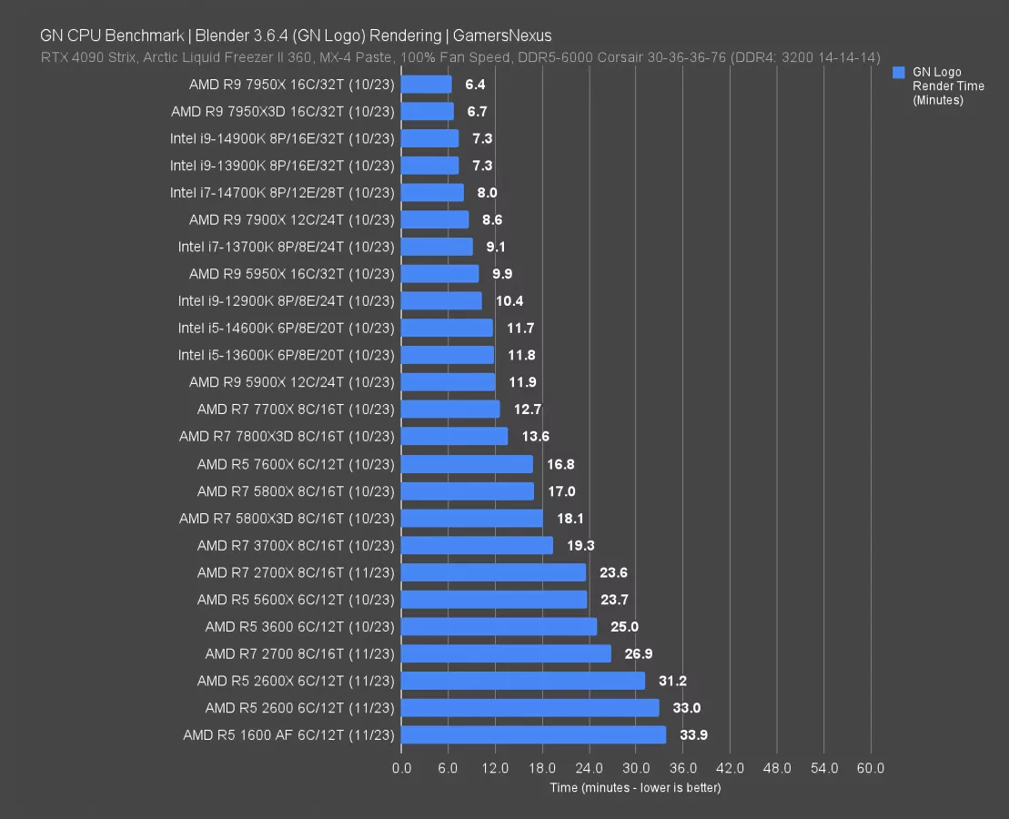 Now we’re moving on to production benchmarks, including Blender rendering -- which we should rename Blendering. For this, we’re adding the 5950X and 5900X to the charts, as they may be viable upgrade options for anyone who’s heavy in non-gaming workloads. In Blender, smaller bars are better, so we don’t invert the axis and turn it into a rate for this test but instead use the base metric of time. Some other tests conducted in suites, like Puget’s, invert the axis and use aggregate calculations for “bigger bar better” charts. But we keep it simple in Blender. Calculating improvement means % time reduced for CPUs that complete the single frame fixed unit of work in less time.