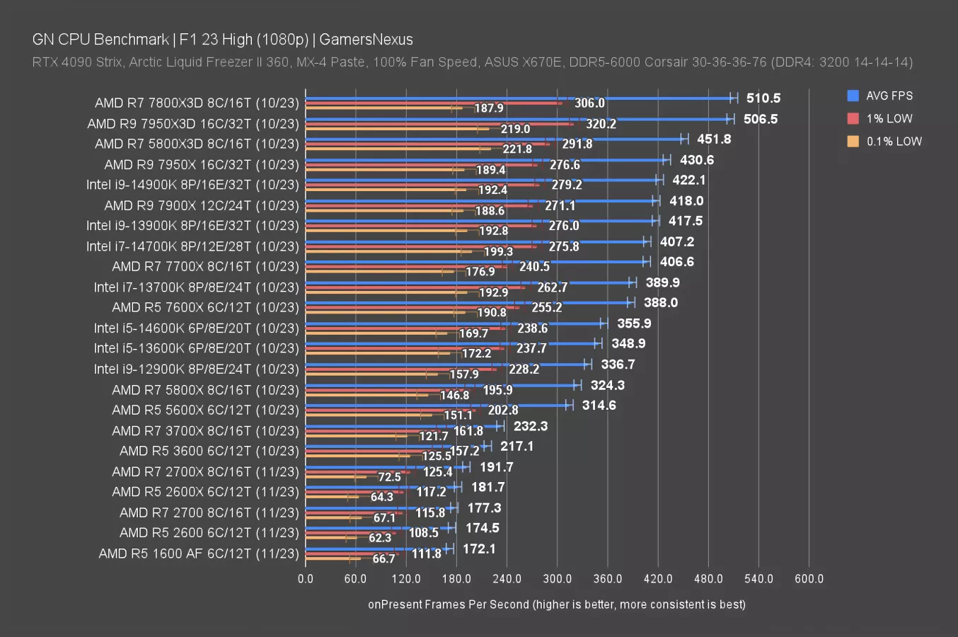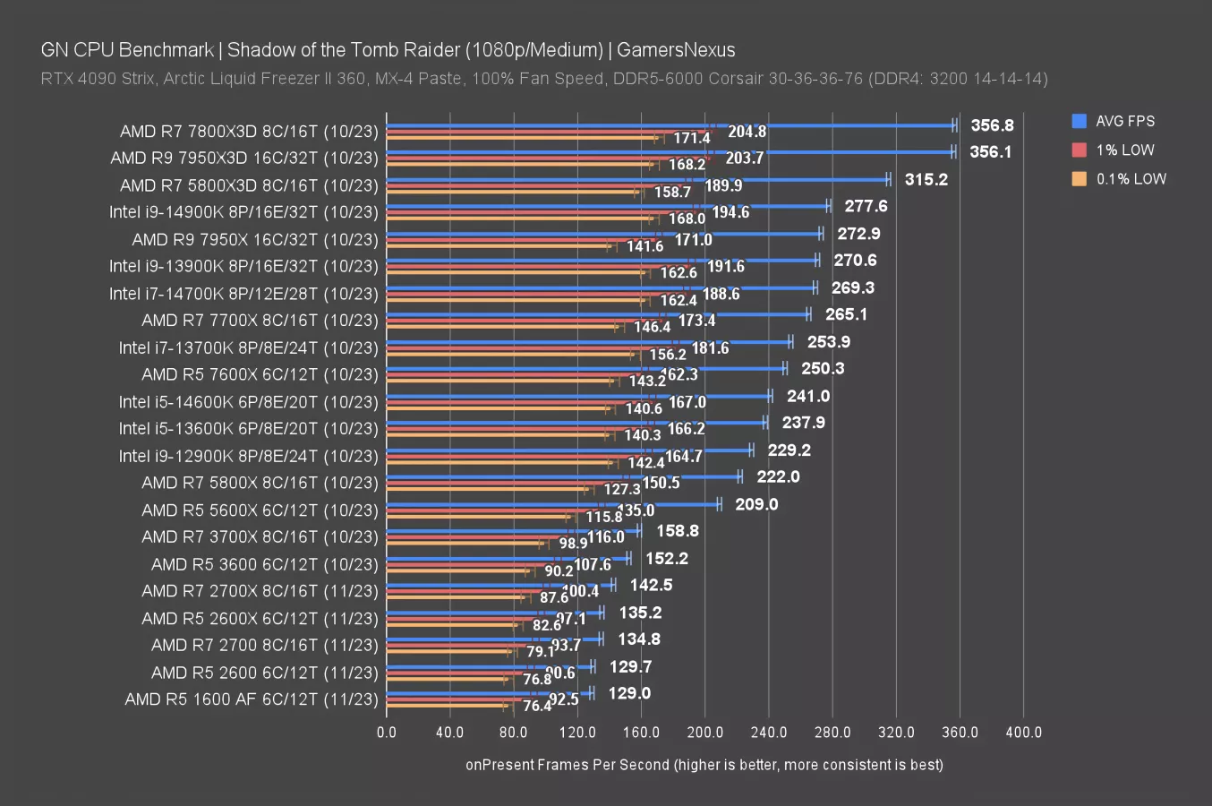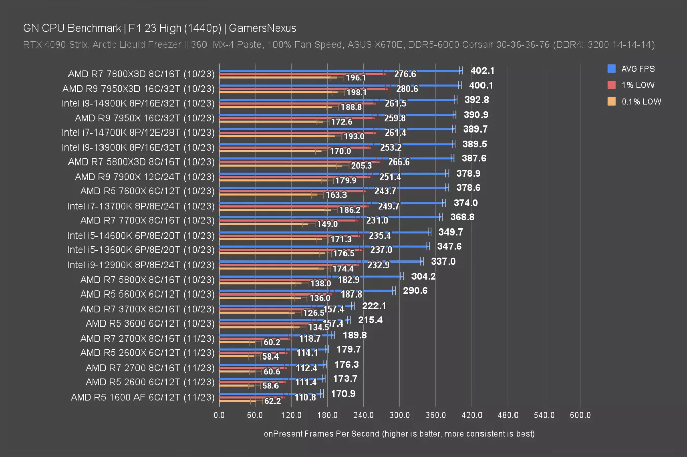The 7800X3D boosts further, at 181% over the 2600X. Intel’s options might land you on a 13600K at about 350FPS AVG or the 14700K at 407FPS AVG, which itself is about tied with the 7700X (although it produced higher 1% lows, at least on a technicality).