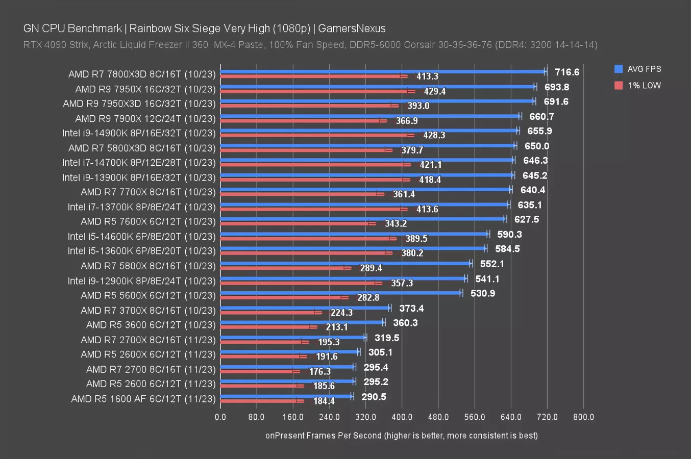 Our last game test is for Rainbow Six Siege: In this benchmark, the 3D cache scaling is huge. You can see that when jumping between the 5800X and 5800X3D (at 552FPS AVG to 650FPS AVG, or from the 7700X’s 640FPS to 717FPS AVG with the 7800X3D). The older 2000 series had the 2600 at 295 FPS, the 2600X at 305, and the 1600 AF at 291. The improvement to a 5800X3D is massive here, at 120% from the 2600. The jump to the 5600X is also a meaningful change. New builds with a 7800X3D would multiply in performance to 717FPS AVG, with the Intel 13600K mid-range option offering a step between the 5800X3D and 5600X.