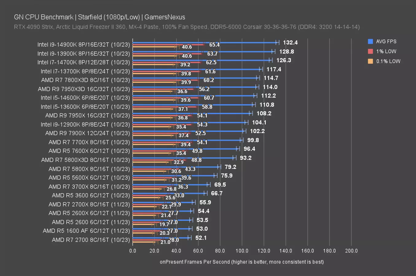 The R5 2600, X, and 1600 AF all ran at about 53-54FPS AVG. The 2700X was around 56FPS AVG, so not much difference there. The 2700 data on this chart is within error of the 2600 and 1600 AF. Another round of reruns might get us another 1-2 FPS depending on variance. That’s within error. But the 5800X3D definitely isn’t: The 5800X3D would give you around 71% uplift against the 2600X. That’s not as crazy as in some other games, but still a huge improvement. The 14900K sets the ceiling at 132FPS AVG in this one, so the 13600K or 14600K would be viable alternatives providing around double the framerate.