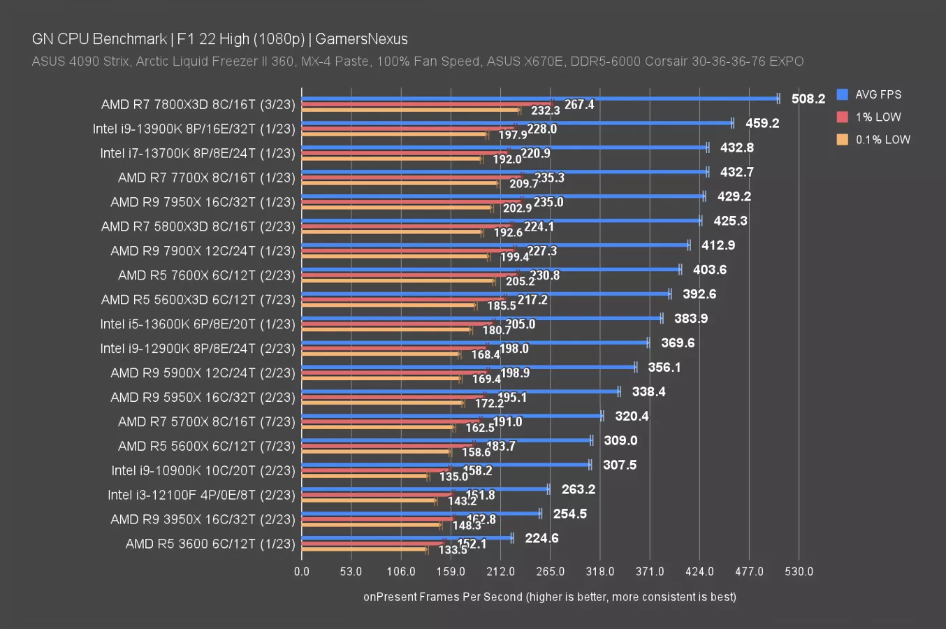 The 5600X3D held about 600FPS AVG. For reference, in the pre-patch tests, the 13900K was over 800FPS -- there’s plenty of room for scale left here. That means the 5600X3D gained about 14% over the 5600X in average framerate performance, with lows also boosted. The lead over the 5700X is only 11% in this one.