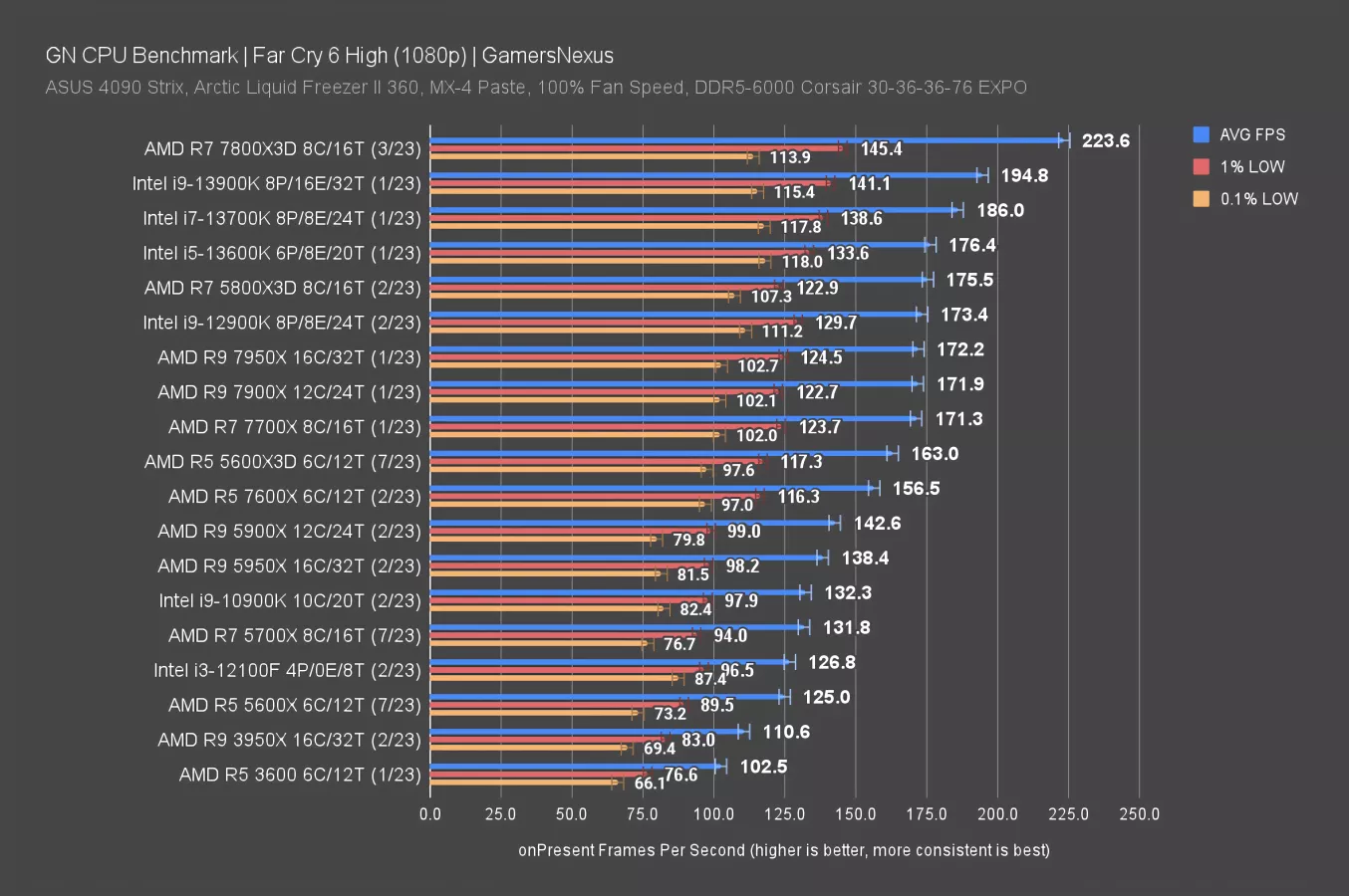 In Far Cry 6 at 1080p, the 5600X3D ran at 163FPS AVG, boosting it 30% over the 5600X-non-3D, with lows also higher. As we’ve seen before, the V-Cache works in the right scenarios. The 5700X’s 132FPS AVG allows it good value positioning -- basically where the original 5800X should have been -- but the 6-core X3D still outperforms it significantly here. The extra cores are less helpful in this game.