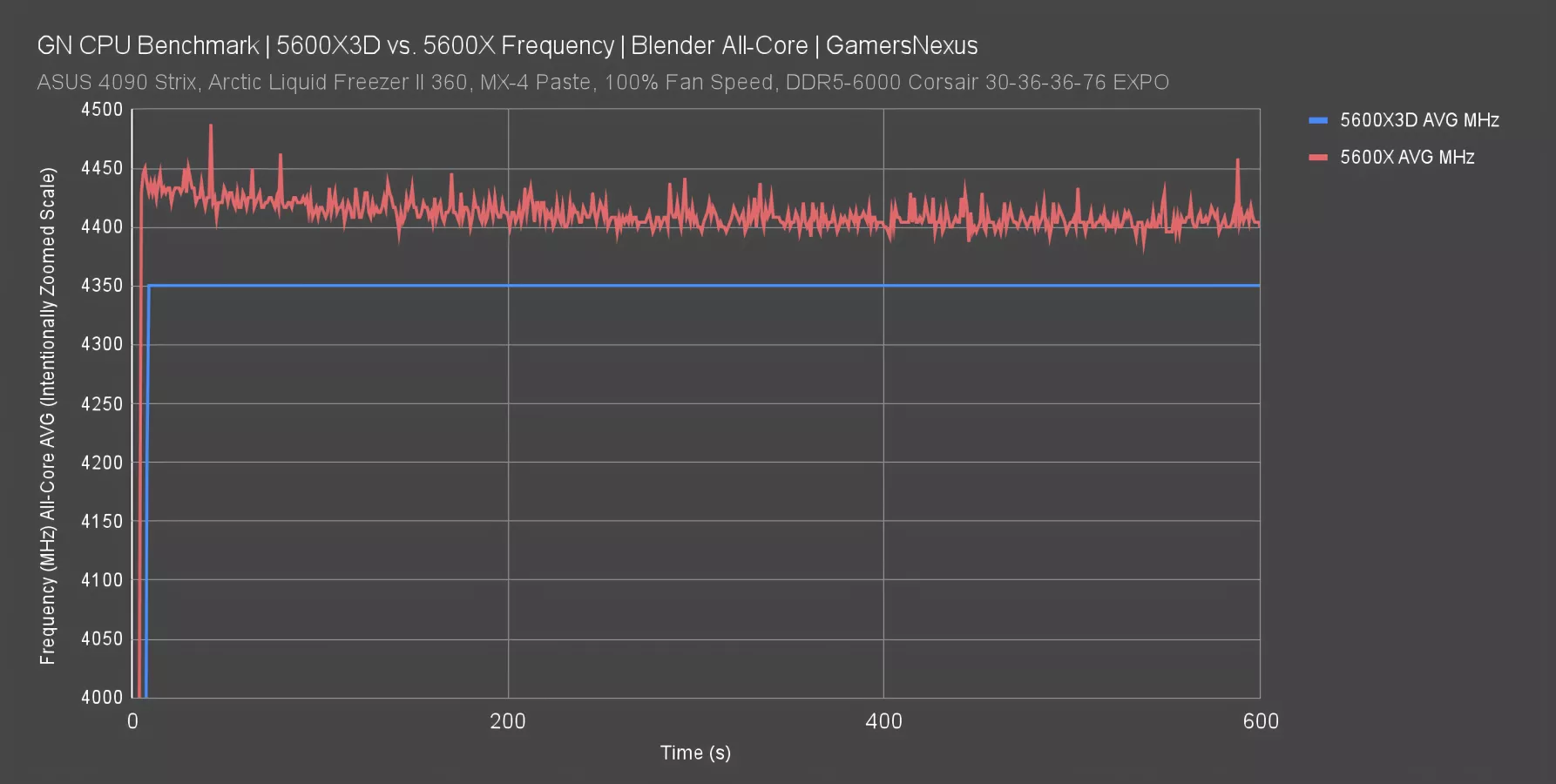 In this one, the 5600X3D was still below the advertised 4.4GHz speeds. AMD isn’t hitting what it’s marketing. Being off by 50MHz is a pretty big gap. Now, technically, there are a few blips to 4400MHz or just past, but 6 plotted seconds of 500 doesn’t really qualify for hitting that marketing, in our opinion.