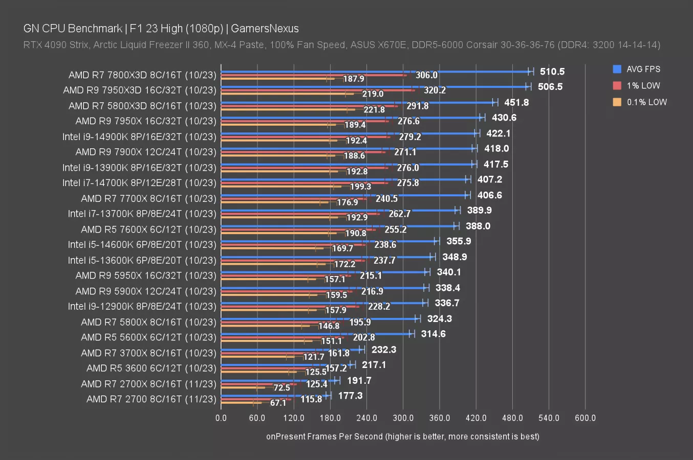 The 5800X3D offers a staggering 154% uplift over the 2700, or 136% over the X-SKU. If you wanted the modern I/O capabilities of a new platform, the 7800X3D would boost that to a max of 188% against the 2700. The 7700X comes in lower than the 5800X3D again, but would get you to a new platform while still providing 130% improvement. The 14700K is about the same uplift at 407FPS AVG, with similar benefits of a modern platform for those who know they need them.