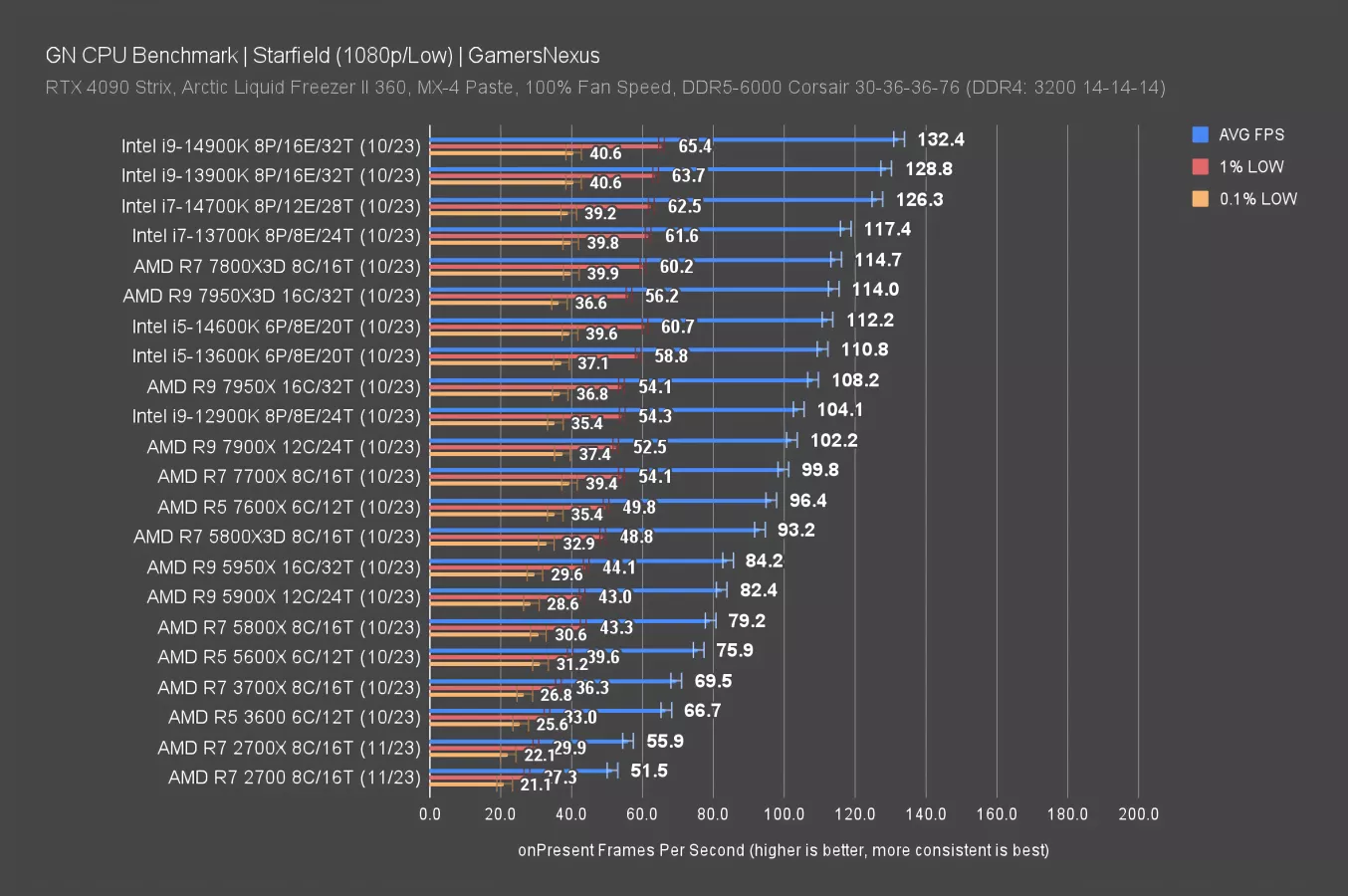 Starfield is up next. This is another brand new game, so we have a lot of new titles in this bench suite for your upgrade considerations. We recently ran standalone CPU and GPU benchmark pieces on Starfield (and we’ve published a Starfield Graphics Optimization Guide, too), so you can get the full research from those.