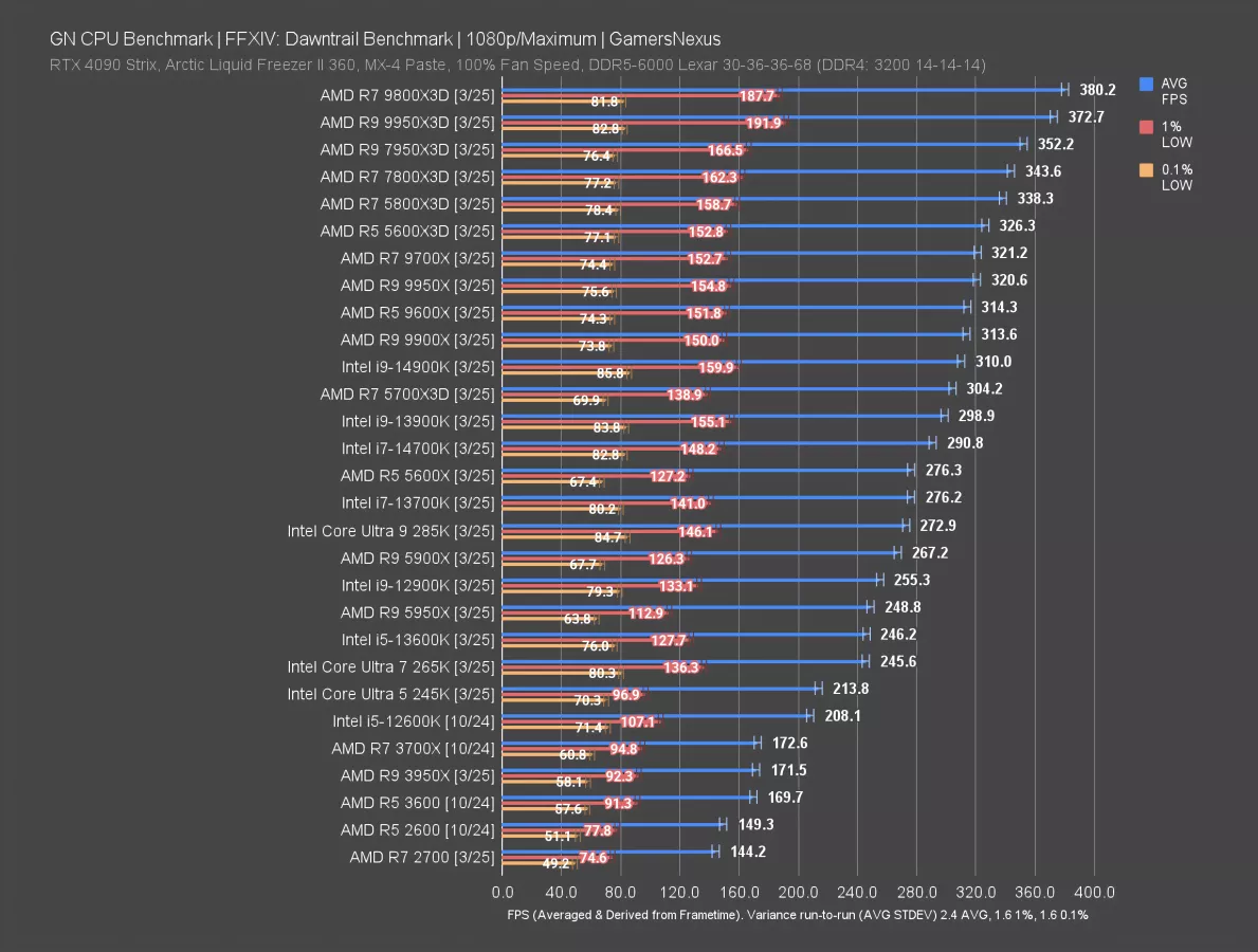 Intel’s closest CPUs don’t appear until the 14900K at 310 FPS AVG. This is mostly interesting because there was a time when Final Fantasy’s prior benchmark versions were entirely dominated by Intel, with the clean division halfway down the chart. This is actually what we’re seeing now favoring AMD, relegating Intel to the bottom. That’s flipped in recent years and generations.