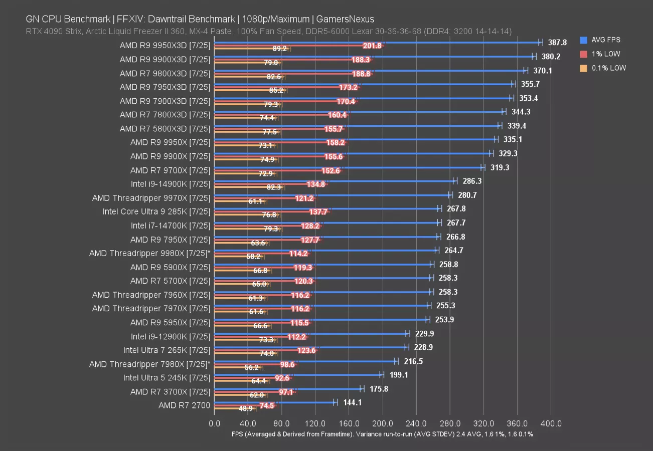Final Fantasy 14: Dawntrail is next. The 9980X and 7980X high core-count CPUs had some major inconsistency issues in this game, so there’s an asterisk next to their entries.
