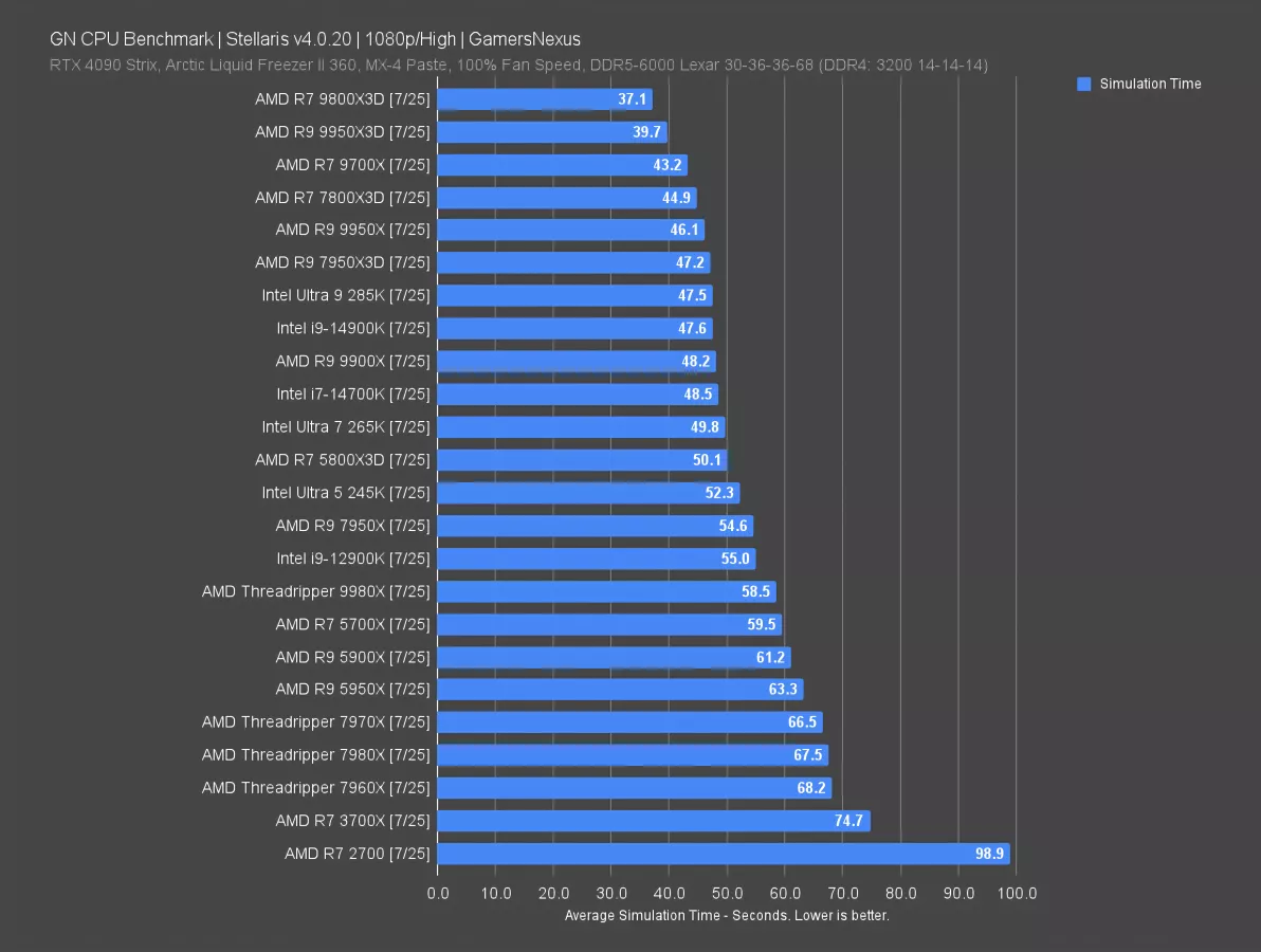 Stellaris simulation time is first. The 9800X3D is the current leader at 37.1 seconds on average for simulation time. The 9700X follows this at 43.2 seconds, benefitting from Zen 5 architectural improvements over the prior generation. The 285K isn’t what we’d call “good” here, but at least matches its predecessor.