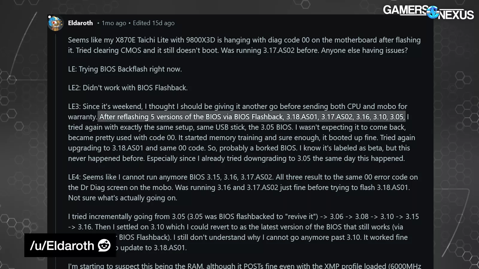 User u/Eldaroth explained that a 3.10 flashback didn’t immediately solve the problem, but after a second attempt at a 3.05 flashback, Eldaroth was able to “revive” the system. From there, the user flashed back to newer BIOSes and found 3.10 was the latest option working for the build.
