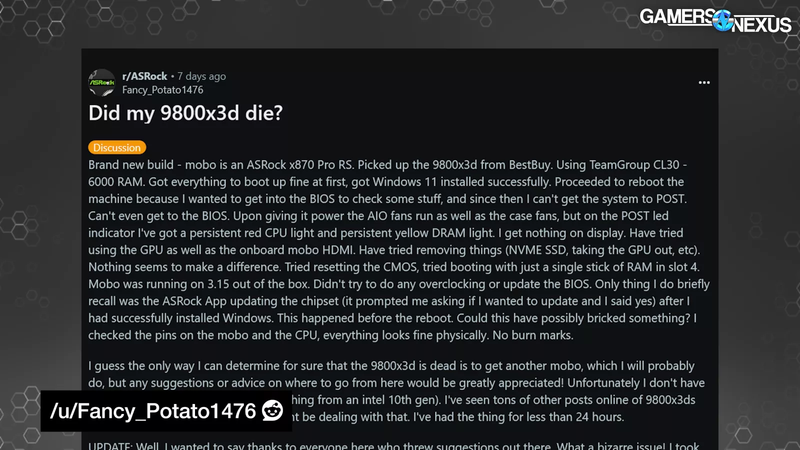 These ASRock and 9800X3D failures are different: They’re happening sometimes months into use, meaning that the systems did work, but stopped spontaneously.