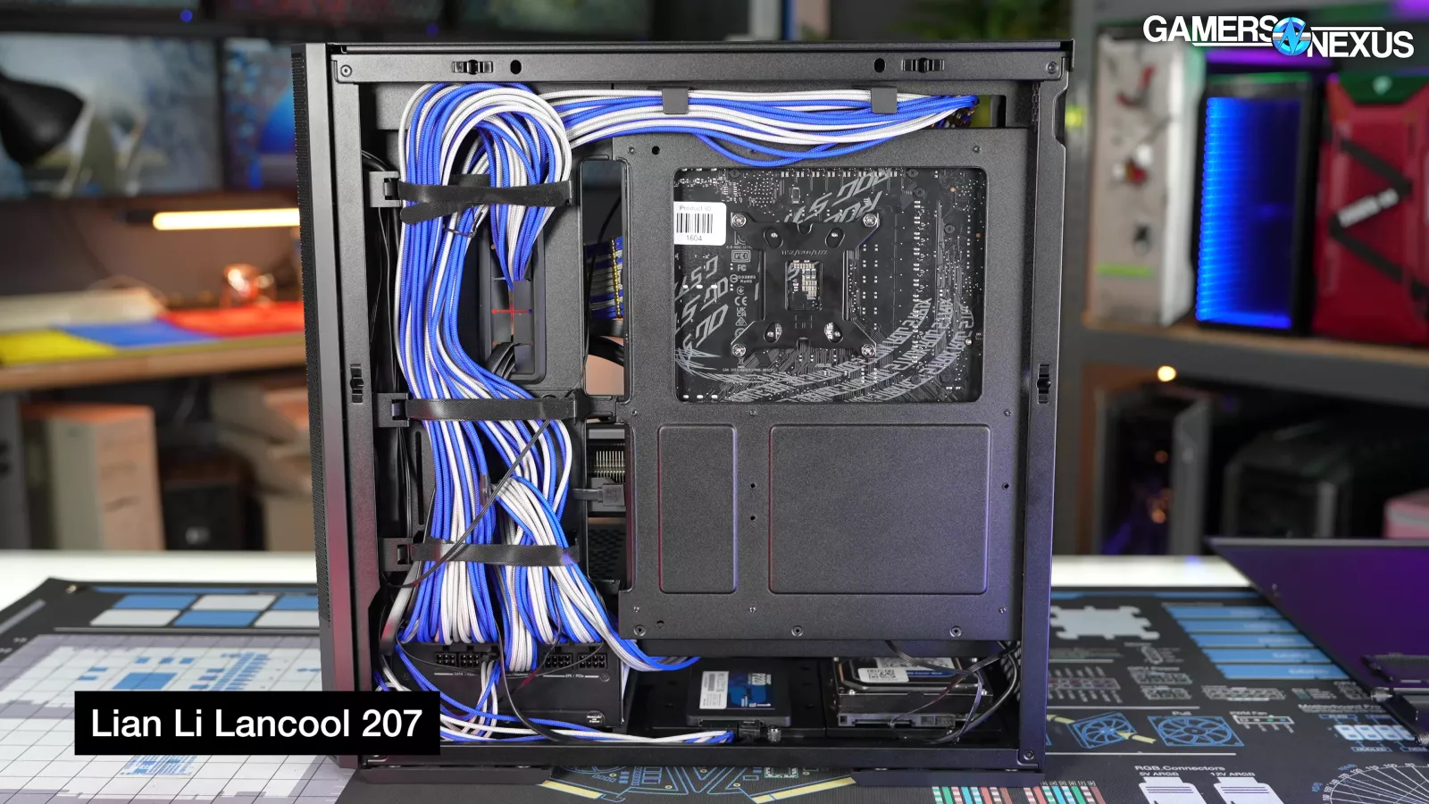 We have two big issues with the 207: first, the toolless side panel won't stay on without meticulous cable management. There's no way around this, but sticking to flat cables and minimizing the number of cables used will help. There's also room to improve PSU cooling in the case, as most PSUs will be oriented fan-side-down with barely any clearance above the table surface. The cable management is the one to be aware of. You can watch our review for more on that.