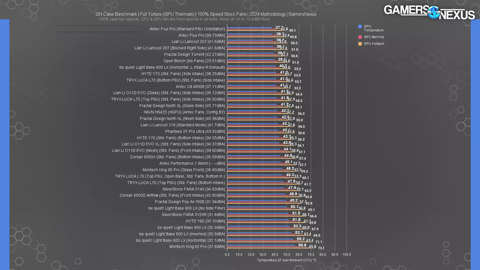 Noise-normalized thermal tests are the most important performance benchmarks we run on cases. With the current iteration of our bench, we place the case on a table in our hemi-anechoic chamber with a mic pointed directly at the center of the front panel from one meter away. Then, we lower the speed of the case's stock fans in tandem until we hit our chosen threshold of 27 dBA SPL. This allows us to level the playing field so that the cases with the loudest fans don't automatically land at the top of every single chart by brute force. It creates a control.