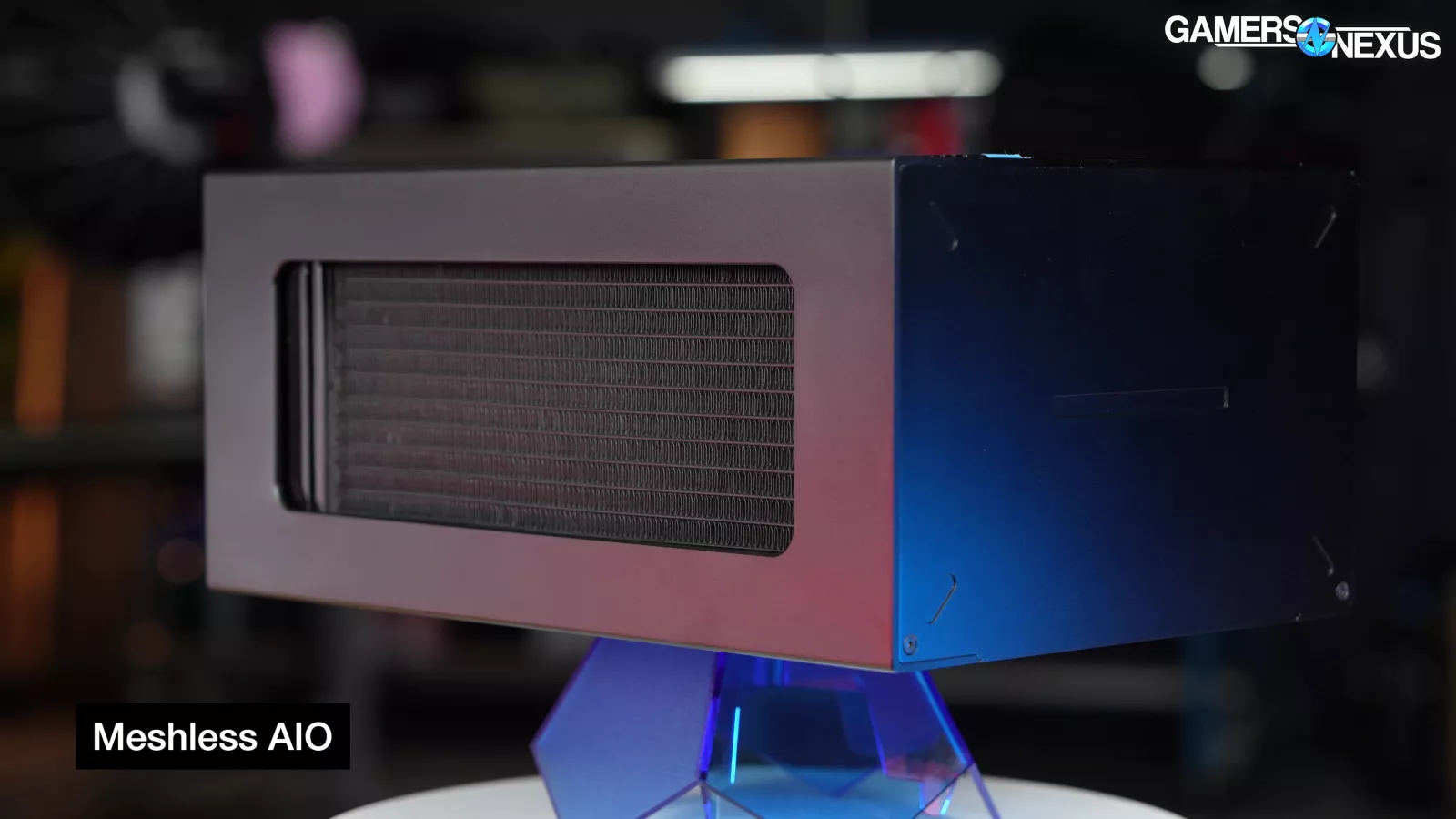 The Meshless AIO (now apparently listed with a formal launch name as the “MD280”) is built around a cylindrical crossflow fan, like a smaller version of the fan in a mini-split wall unit. We found the case design curious enough that we built this 3D animation to help explain and educate on how these work. The basics are that the crossflow fan shoots hot air out at the upper edge of the side panel, and theoretically pulls cool air in everywhere else: towards the GPU fans from the side panel, through the radiator, and over the motherboard and PSU from a tiny strip of ventilation along the bottom edge of the case. In practice, we found that the GPU was better cooled by taping a couple of normal 120mm case fans to the top of the case, but these had other downsides in other tests.