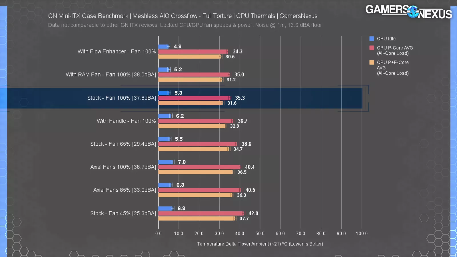 CPU thermals are tied at the top of the chart with the Lancool 207 at 41 degrees Celsius above ambient all-core and 45 degrees on just the P-cores. Some of our other high-performing cases like the North XL and Torrent come close, and the Lian Li Lancool 216 (watch our review) is tied in this one, but the Flux Pro is the best overall when taking all results into account.