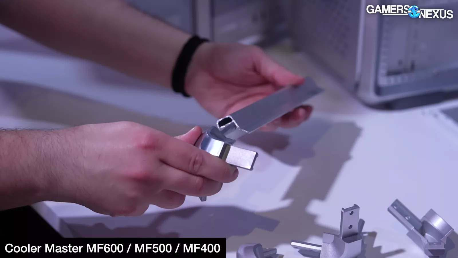 For the MF series, which we’ve decided means “Motherf*ckin,” Cooler Master has the MF600, MF500, and MF400 cases as pre-configured options of an otherwise totally modular approach to case design. The MF series will use a set of 8 corners and 12 columns, meaning that each case starts as a box of parts that can get screwed together into a case. These columns and corners will couple with a rails system internally to build the motherboard tray, allowing the cases to be reconfigured into nearly any layout. That includes inverted, mirrored or flipped, standard ATX, and also different form factors altogether.