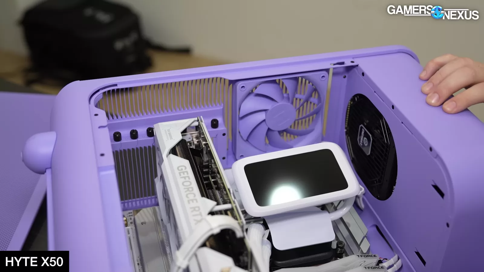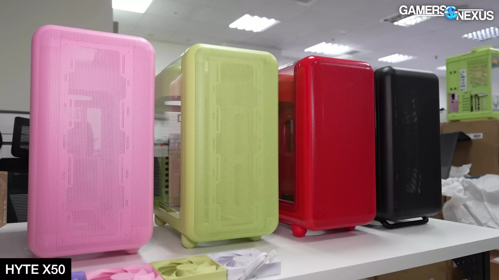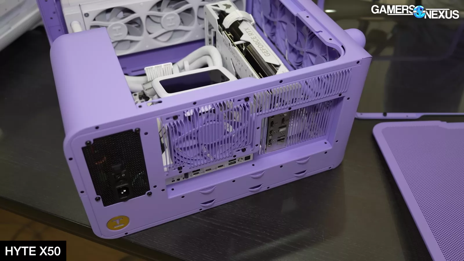 Hyte showcased its new X50 case, which is its most mechanically complicated product to manufacture to-date. The X50 uses a bubbly external look while attempting to be the highest-performing case on benchmark charts. Hyte uses a front panel that’s perforated all the way around the apex of the turn, leaving only a small strip at the mounting point for rigidity. The case also has louvered slats at the back, including for the PCIe slots, which add mechanical and manufacturing complexity but strengthen the chassis structure while improving airflow performance. Hyte noted that its intent, which we’ll test in our review, is to help project air away from the system, highlighting that there’s always focus on reducing intake impedance but noting that exhaust impedance is similarly important.
