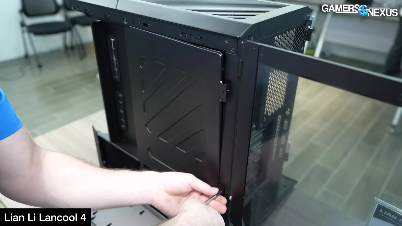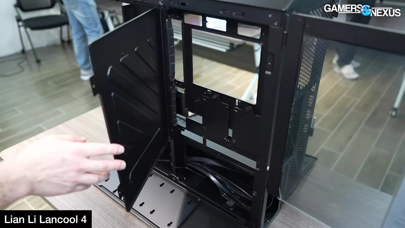 The Lancool 4 is more complicated and is entirely new tooling. The case still uses the 4-door approach that the Lancool series has become known for, so the left side features a large sheet of glass resting on top of a mesh plate that opens separately. The mesh plate allows intake through fans mounted in the bottom of the case (or just the GPU), with lower panel side mounting available for 120mm fans. The panels open with a button release mechanism to allow them to separately lock. The right side also features glass and steel, with a clear line of sight through the other side of the front of the case. A cable cover door can be screwed down to hide the cable management.