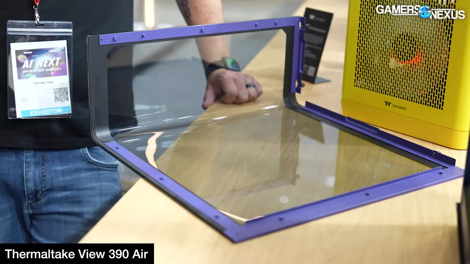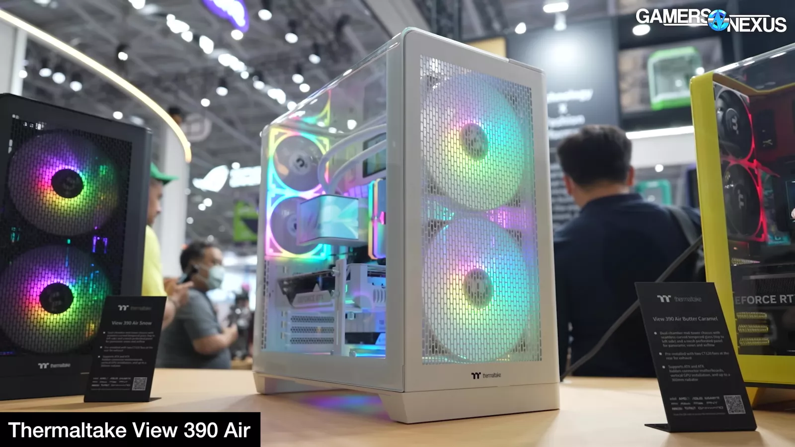The View 390 Air uses a curved tempered glass panel around the top and side, with options for up to 200mm fans at the front. Thermaltake hasn’t yet finalized the stock fan configuration, but has finalized the price: It’s trying to hit $150 pre-tariff and the company thinks it can include 2 fans at that price. They mentioned to us options of either 2x 200s at the front or 2x 120s at the back or side. We’d favor the 2x 200s, mostly because users with liquid coolers will already be getting 120s, and 120s are also more common just in bins of parts from seasoned PC builders.
