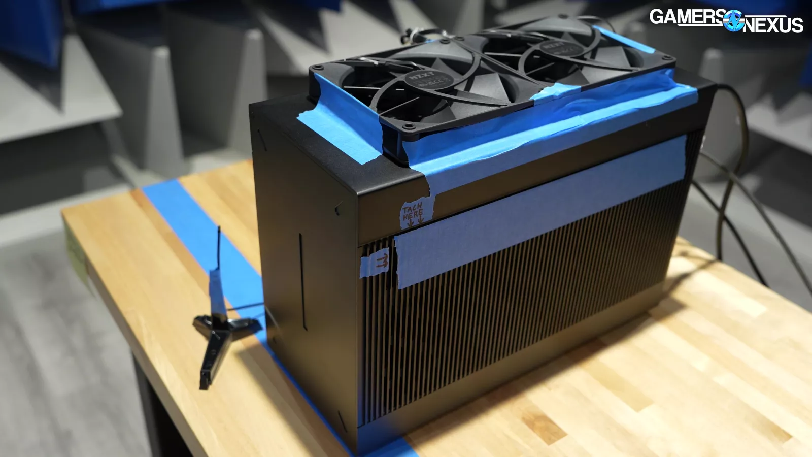 Let’s get into the thermal testing. For this, variables we’re considering include: the fan speed, which can be adjusted to 100%, 65%, or 45% with a switch; the optional flow guide; and the fan being replaced with our hacked-together axial solution just for comparison.