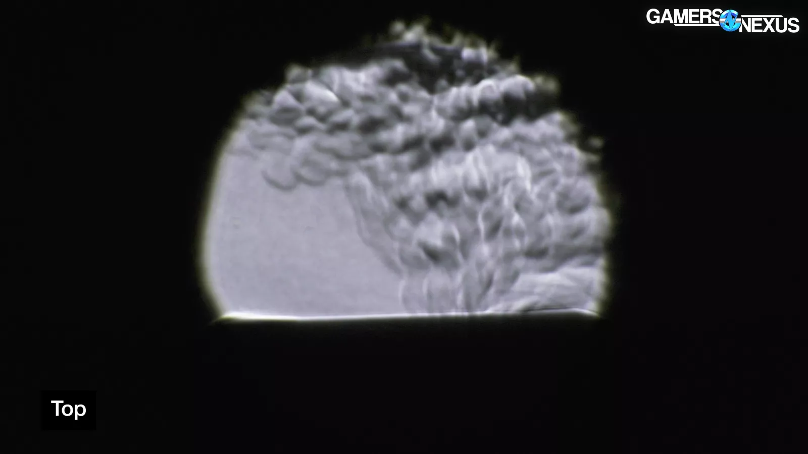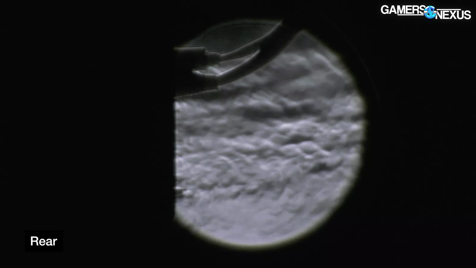 We were curious if the rear was acting as intake or exhaust. You can see that it’s exhaust: The air is flowing out of the case thanks to the video card’s fans. There is some very slight air intake at the bottom-left of the frame at slow speeds.