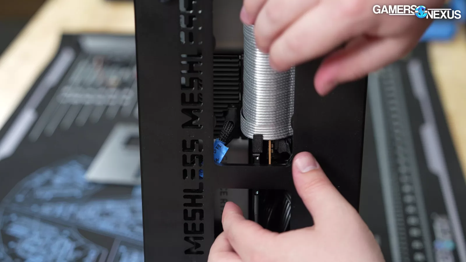 The MESHLESS AIO’s cross-flow fan sits above the GPU and below a CLC radiator by sliding in on integrated rails. The airflow pattern has air come in through the top radiator, the bottom three quarters of the right side panel where the GPU is, and through the mesh slot below the motherboard on the left side.