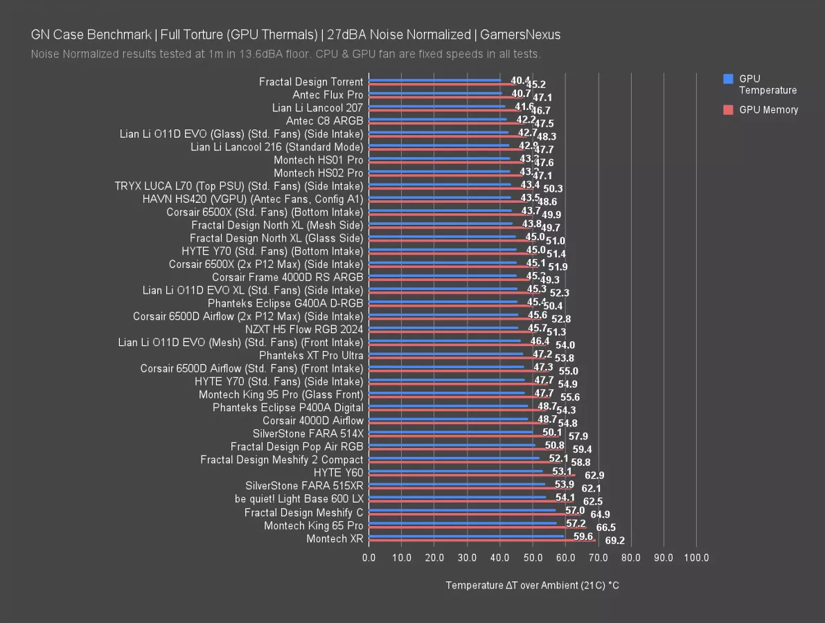As a final note, the VR VCC sensor averaged 30 degrees above ambient in the noise-normalized test with the Frame 4000D. That puts it at the cooler end of what we typically see from cases, with only a couple of outliers like the Lancool 207 and Flux Pro dropping to the 27 degree mark.