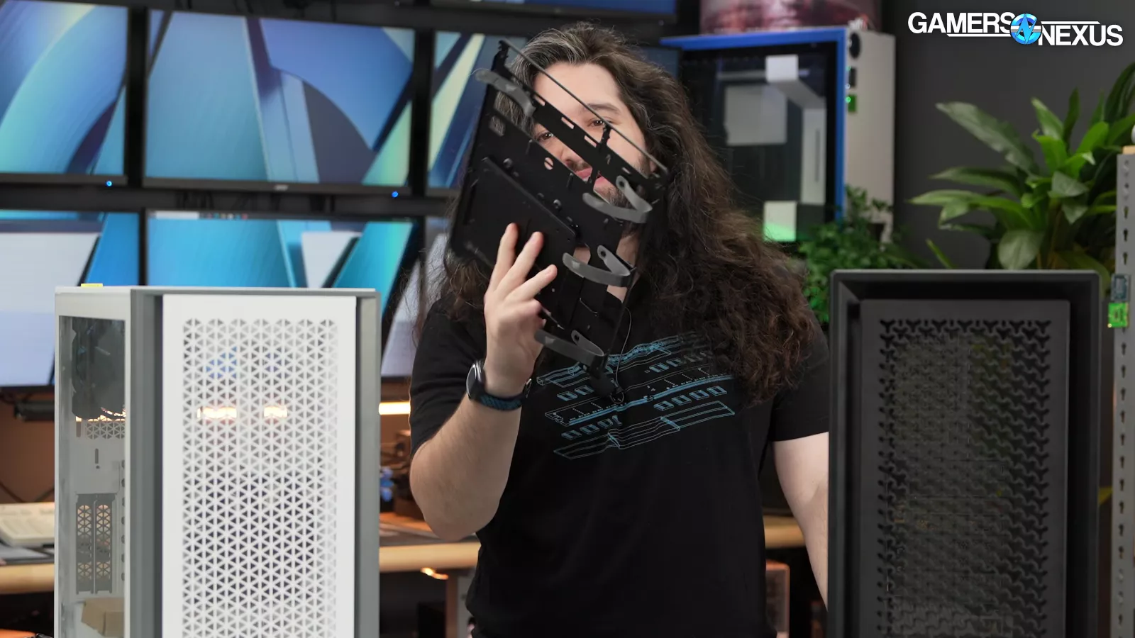 The Frame 4000D is interesting because Corsair has gone all out with the gigantic holes in the front panel: functionally, they're close to having no front panel at all.
