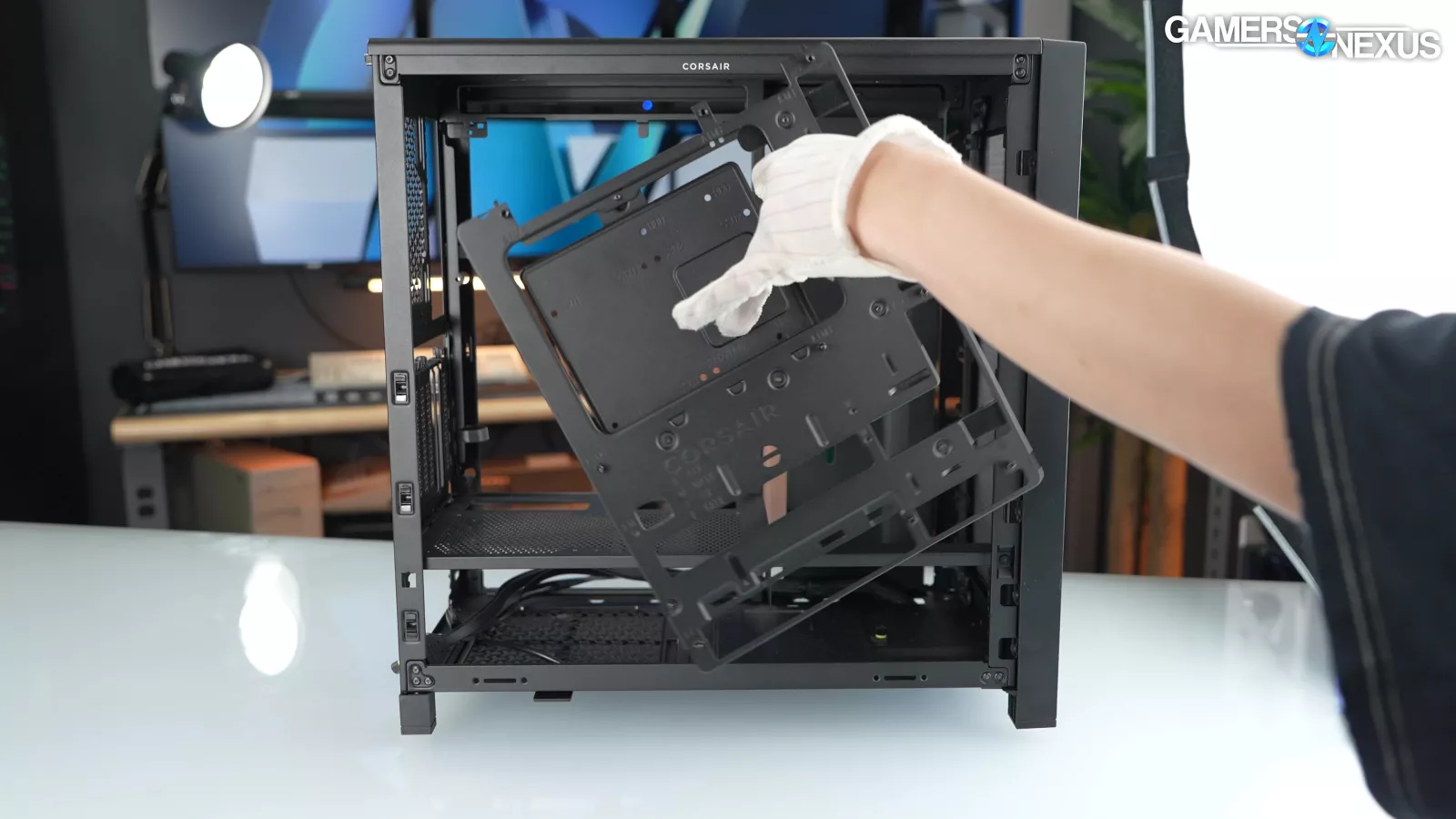 Today we’re reviewing the Corsair Frame 4000D and the case is modular in some interesting ways. For instance, the motherboard tray and power supply shroud/tray can come out. And that’s what gets us to the name “frame.” It’s a frame of a case and it can be reconfigured.
