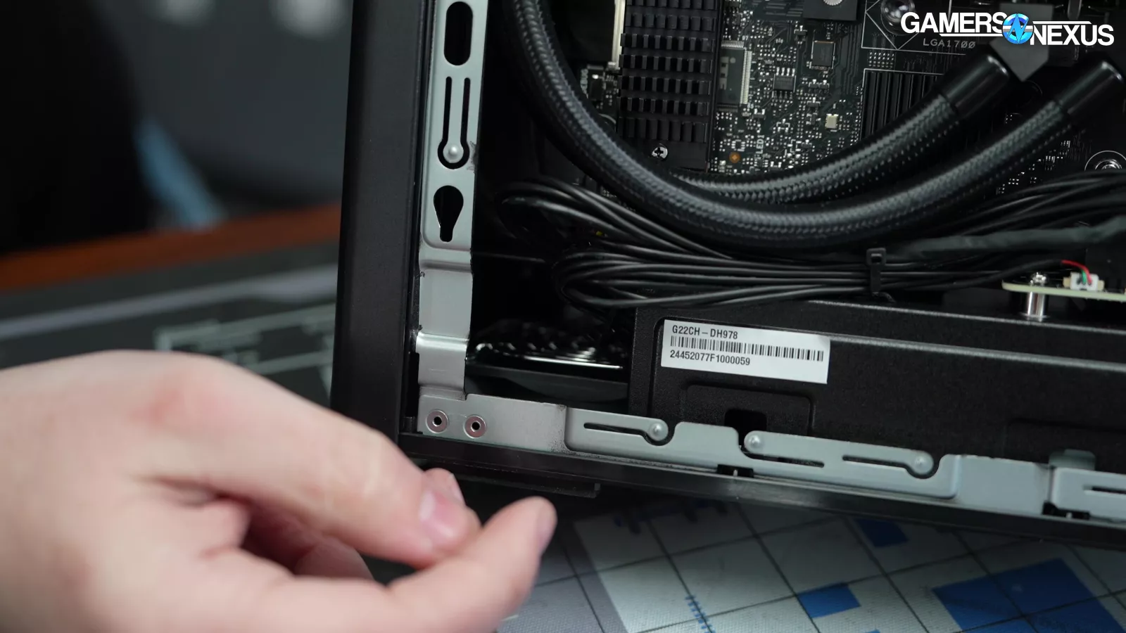 Ignoring everything else, we don’t hate the basic idea – it’s very compact and sandwich layouts with liquid cooling are a proven successful archetype as evidenced by cases like the Era 2 and A4-H2O. The custom-sized liquid cooler is capable of dissipating at least 125W with about 20C of headroom without getting loud, so it could probably handle a 13600K (watch our review). An AMD X3D CPU would have been the obvious best choice for a gaming-focused SFF pre-built, given the generally massive advantage in efficiency they bring.
