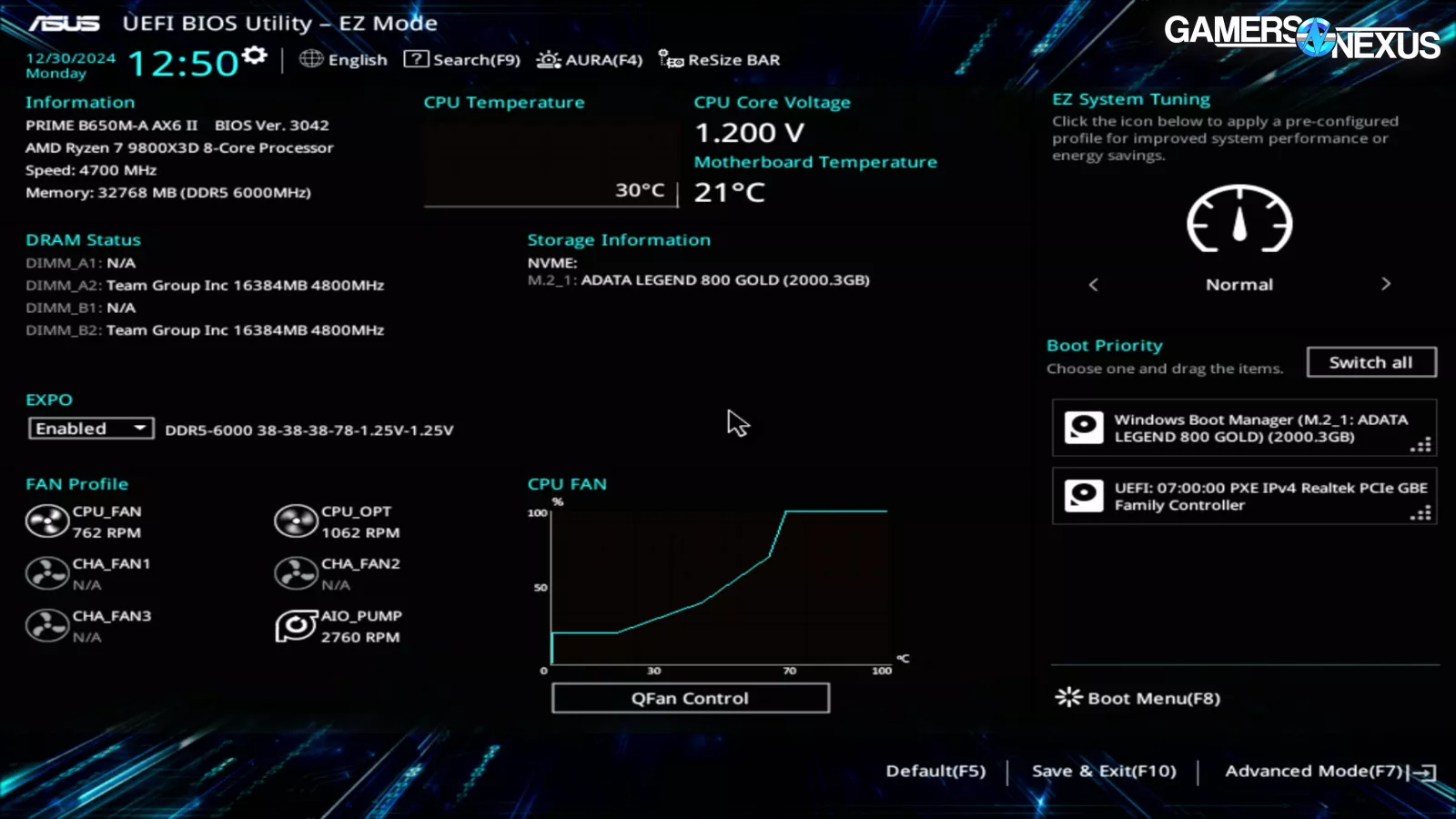 The EXPO memory profile was enabled, ASUS’ performance enhancement was disabled, and almost everything else was set to auto. Cyberpower has a clean BIOS setup that we agree with overall. The only change we’d like to see is disabling the Armory Crate bloatware installer, which is unfortunately a default setting. But EXPO and disabling ASUS’ enhancements are both correct.