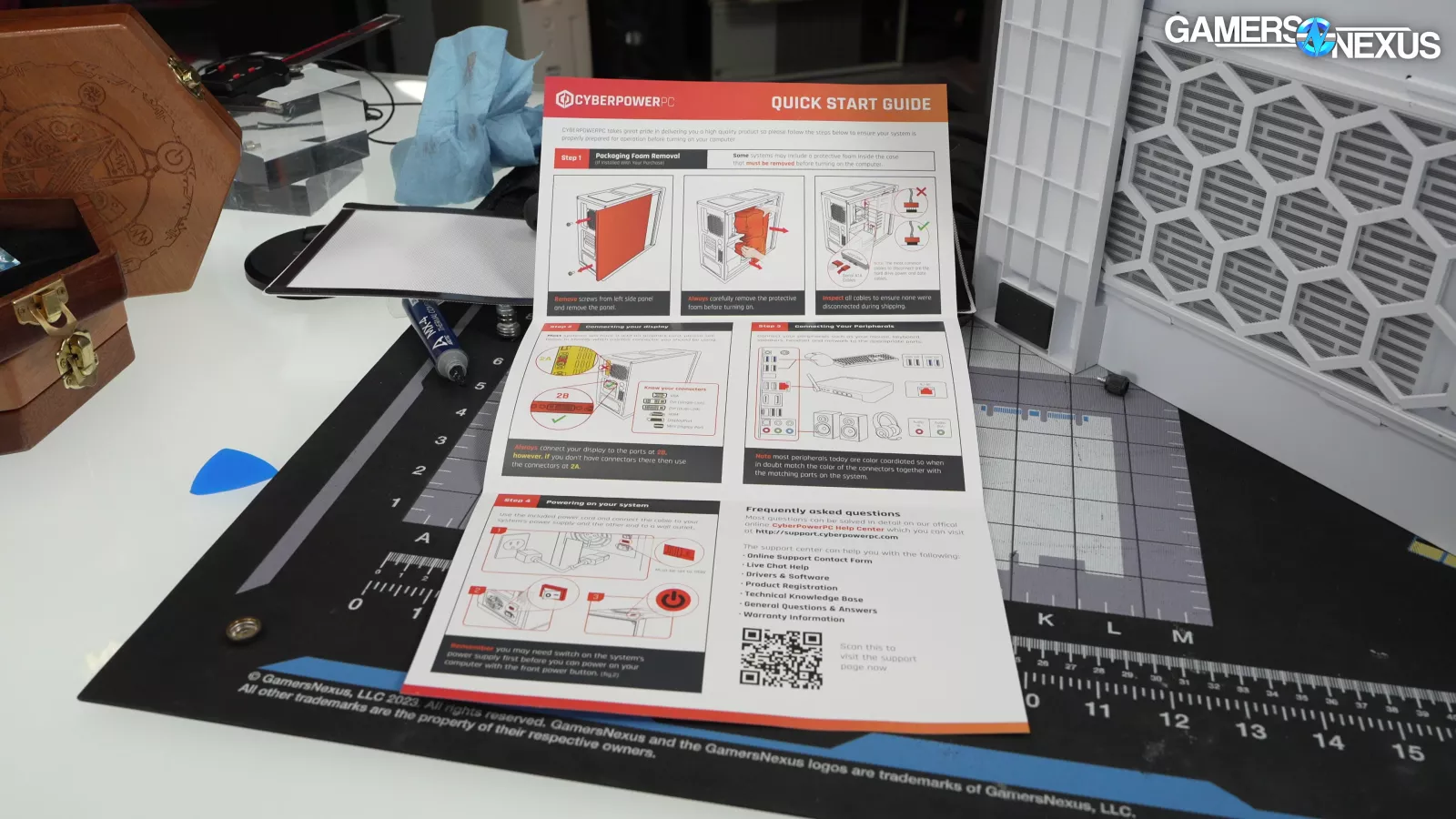 The quick start guide is good. Step 1 guides the user to remove internal packing foam and to inspect for loose cables. Step 2 instructs the user to use the display connectors on the GPU instead of the motherboard, which is the most common mistake, and Step 4 takes care of the second-most common by showing turning the power switch as “on” at the PSU.