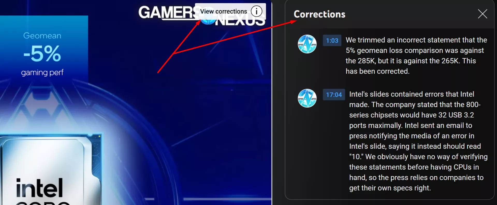 As we are starting this catalog page in October of 2024, we have decided to set an arbitrary start time by crawling back through our videos dating back to October of 2023 for inclusion. This is a slow and manual process. It is possible we have missed something, as there was no process for adding errors to this page until October of 2024. Older content with errors we’re aware of will already have the corrections and should have been addressed, but may not get reflected here if older than October of 2023, as we needed to choose a start date. Our process for going back through old videos mostly relied upon searching the YouTube back-end for descriptions including words like "error" and "corrections." If we missed any in 2024, you may email us at team at gamersnexus dot net. New additions will be maintained as they happen, so this will not be a challenge going forward.