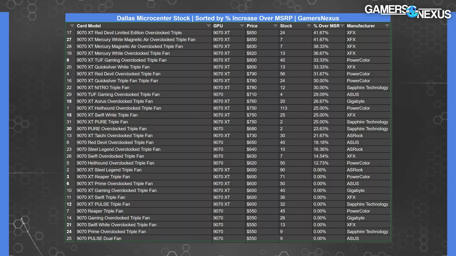 According to this detailed product listing sheet from the Dallas Microcenter, which is the only such one we were able to find, we observed 421 out of 920 cards, or roughly 46%, were sold at MSRP. More specifically, 319 of the 705 9070 XTs and 102 out of 215 9070s were listed with MSRP. This accounts for about 45.25% of 9070 XTs and nearly 47.5% for the non-XTs.