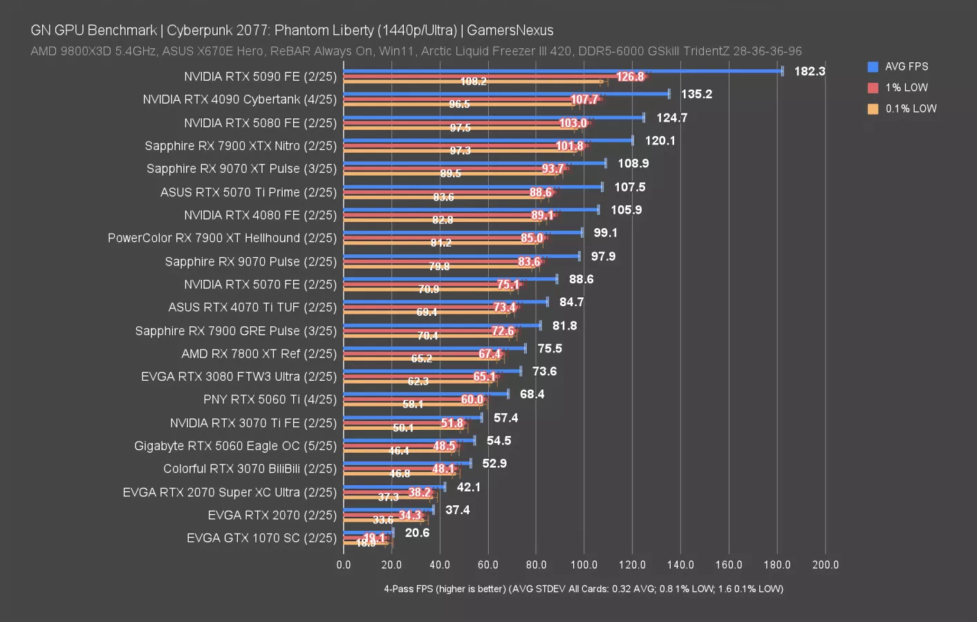 We can show the 9070 though, and that’s at 106 FPS AVG with its own consistent frametime pacing. The lead over the 5060 is 86%. Pricing is also significantly higher, though.