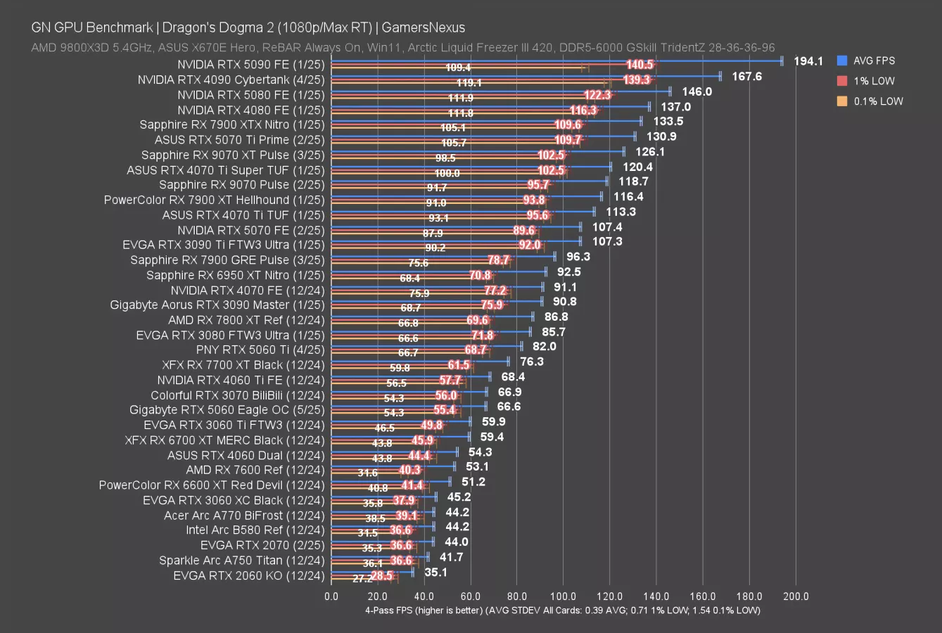 Dragon’s Dogma 2 with ray tracing and tested at 4K has the RTX 5060 at just 30 FPS AVG, which we all know humans definitely can’t see faster than, and so this card is basically perfect. Just like Jensen said.