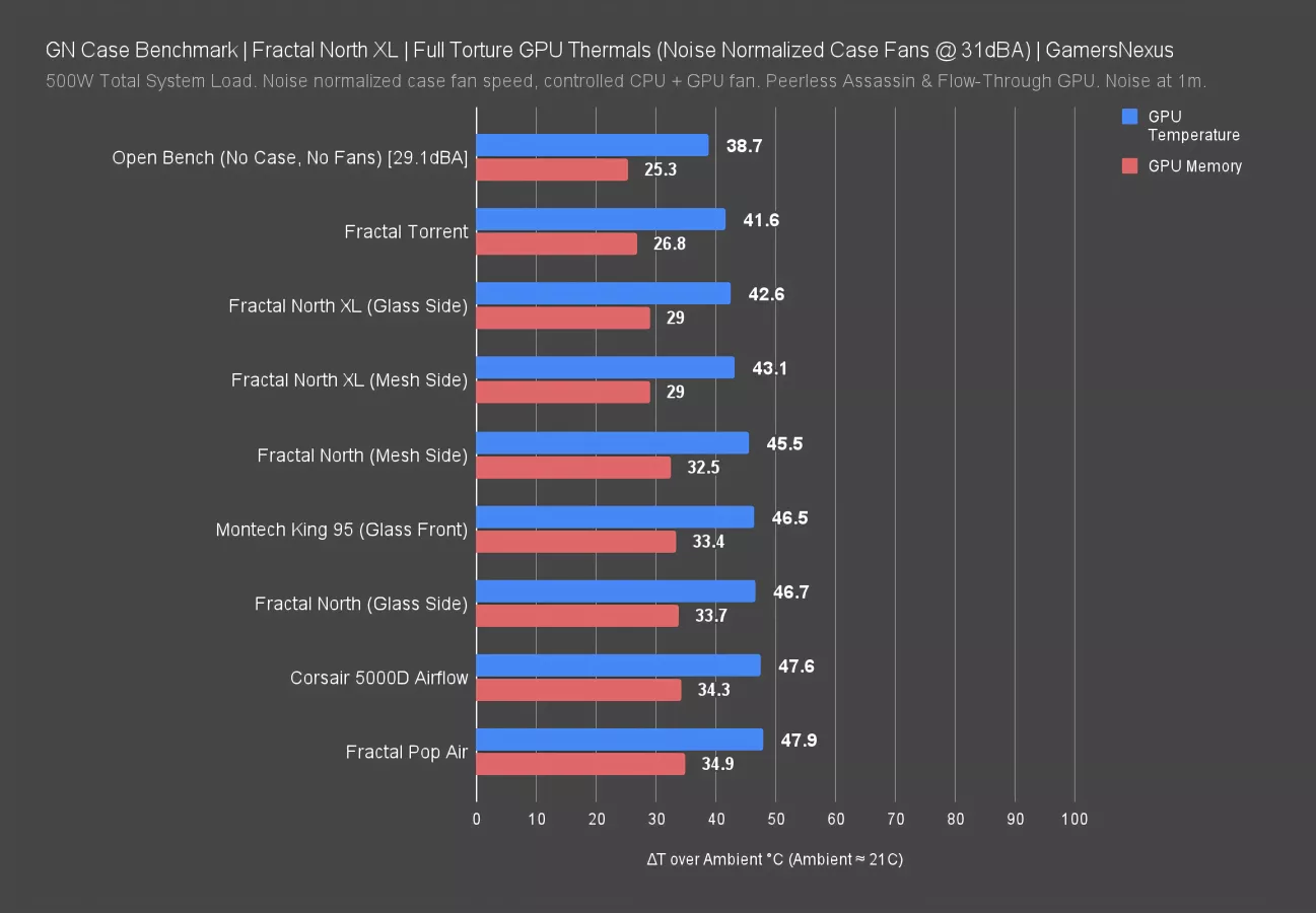 The Torrent leads: With a 41.6 degree GPU temperature and 27 degree memory temperature, which is one of our new metrics. It improves upon the North XL by 1 degree. The Mesh and Glass variations are within error of each other and cannot be stated as to be meaningfully different with this configuration. That would change with an alternate fan layout, such as mounted to the side panel.