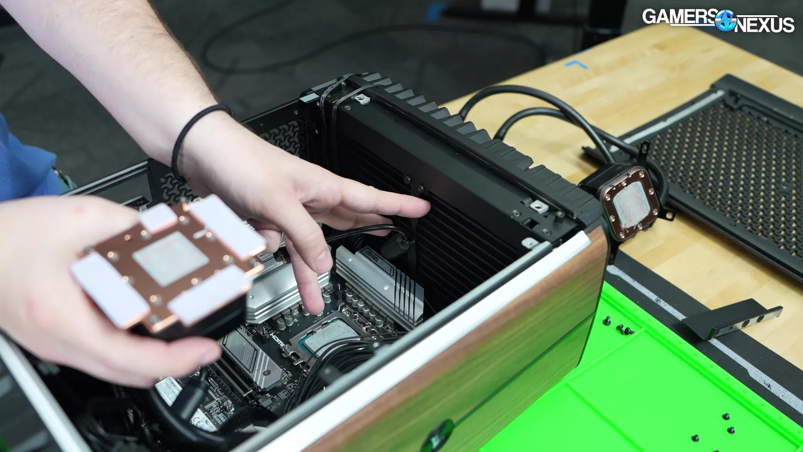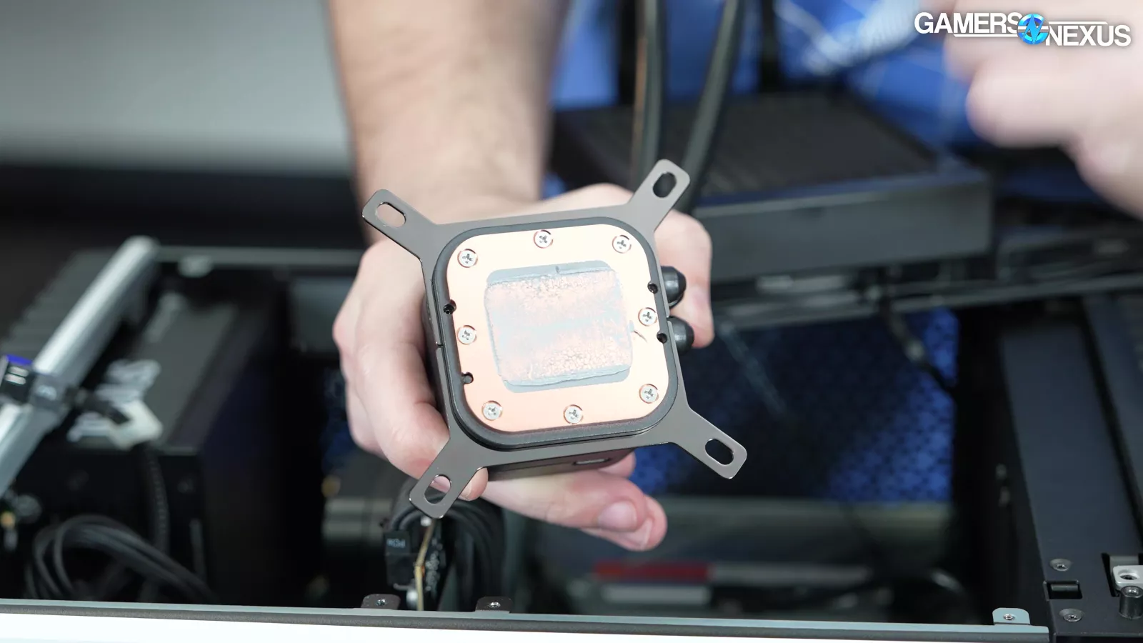 Removing the water cooler, we noticed that there were some loose screws on the mounting bracket. The cooler ended up using a pre-applied thermal paste via silk screen application, which is fine and keeps things consistent.
