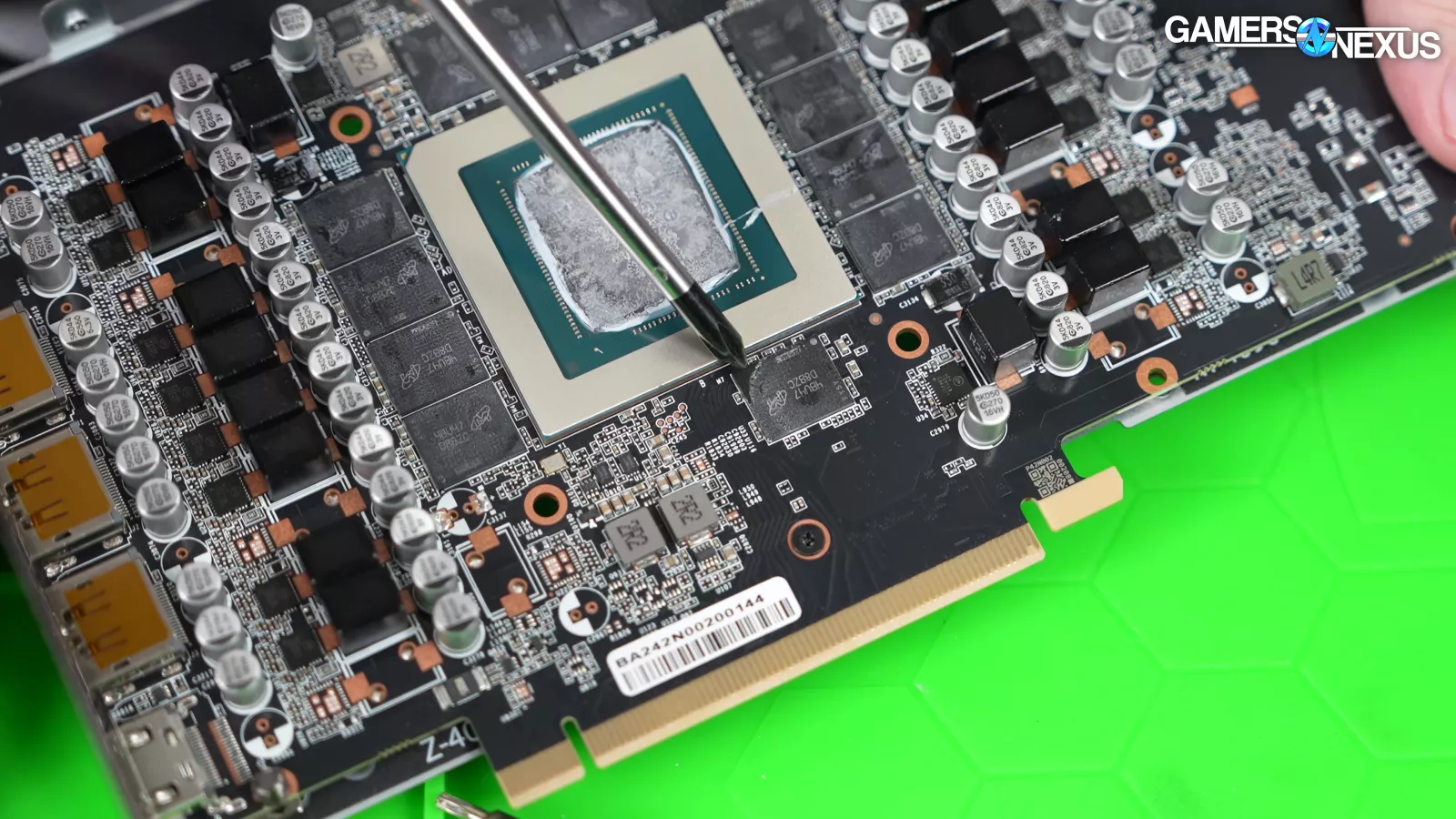 We looked at the space between the PCB and the copper cold plate to check for thermal pads and saw that a corner of the memory module had zero contact to a thermal pad. We also saw poor contact around the edges of other memory modules. This helps explain some of the poor performance we saw in our thermal results.