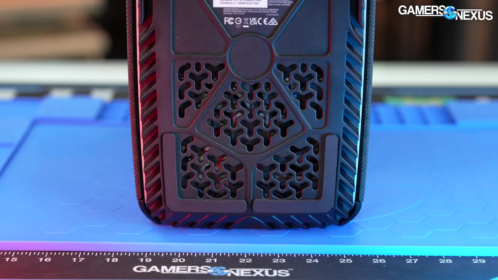 The top and bottom of the case have really bulky aluminum fins. The top gets warm during operation, but the metal isn’t leveraged for cooling in the way it should be. This was a missed opportunity in such a customized build as this is.